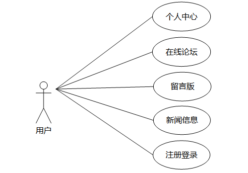 用户在前台查看新闻,在留言版对发布的留言和管理员的回复进行查看,在论坛模块发帖,评论帖子,查看帖子。对用户的功能进行分析之后,将使用图3.6的用户用例图来描述用户的功能。