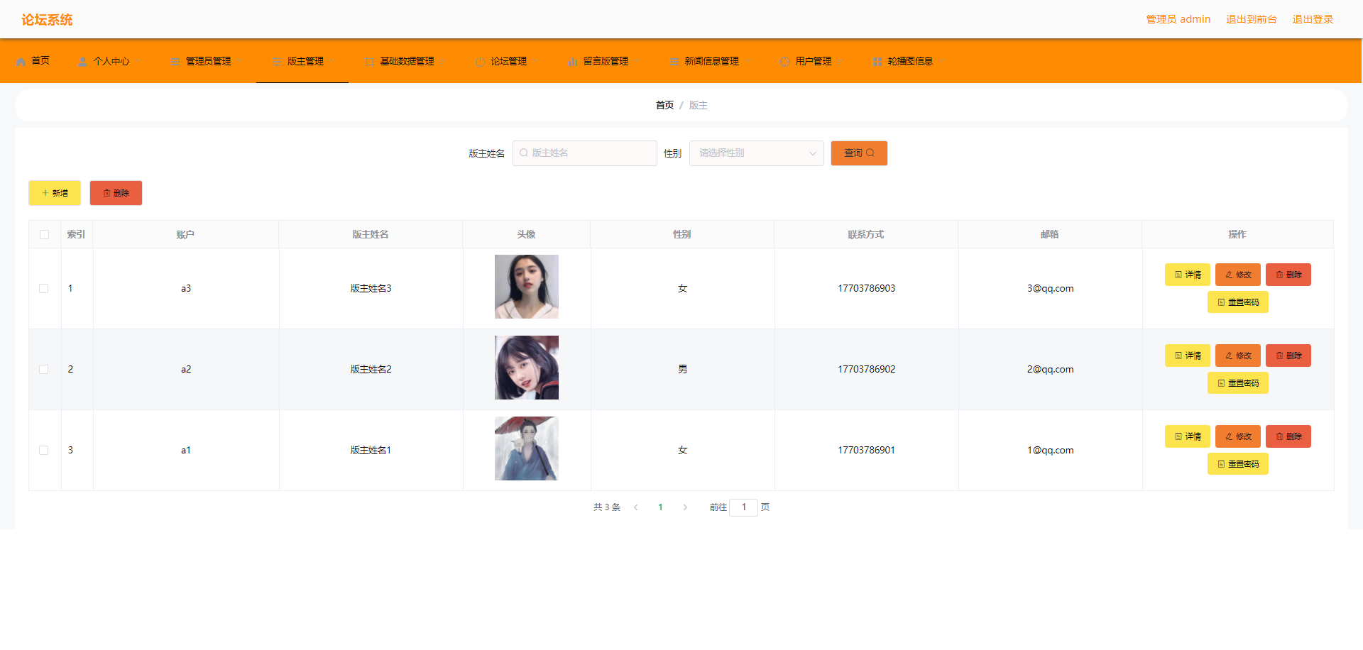 管理员点击导航栏的版主管理链接就进入版主管理界面。版主管理界面如图5.1所示。本功能允许管理员对版主的基本资料进行修改,添加,查询,删除。