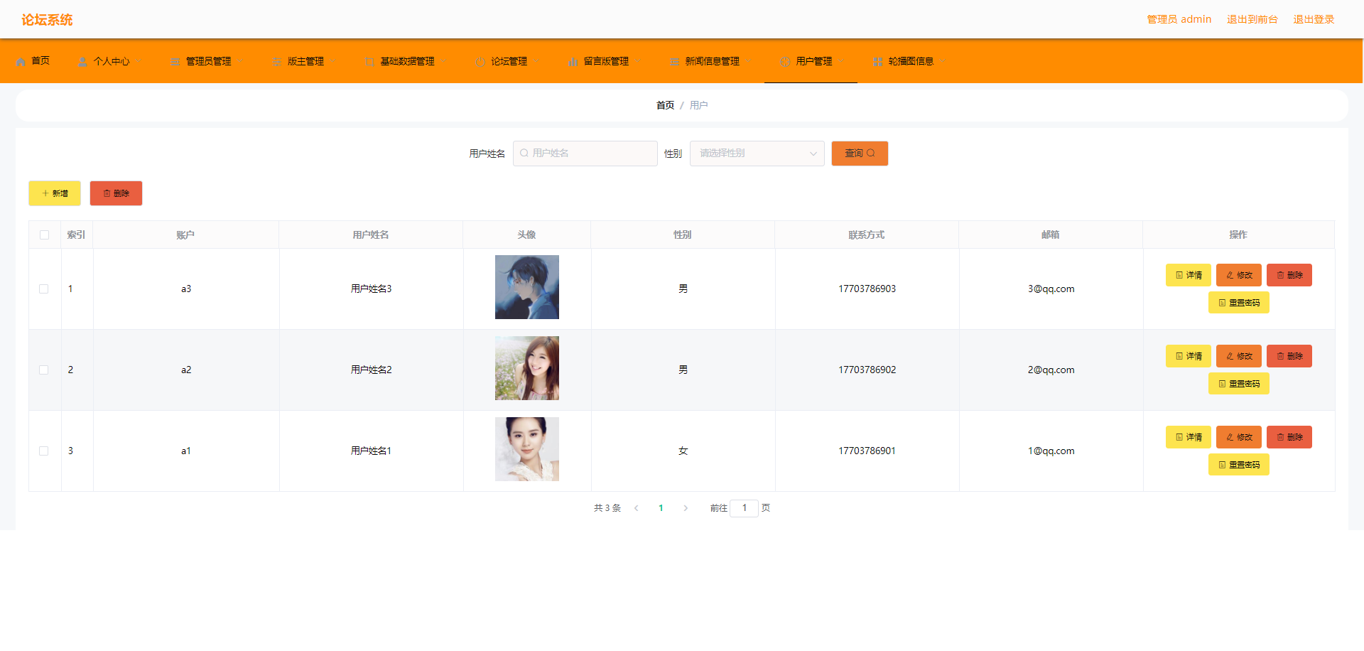 管理员点击导航栏的用户管理链接就进入用户管理界面。用户管理界面如图5.2所示。本功能允许管理员对用户基础资料进行修改,查询,添加,删除。
