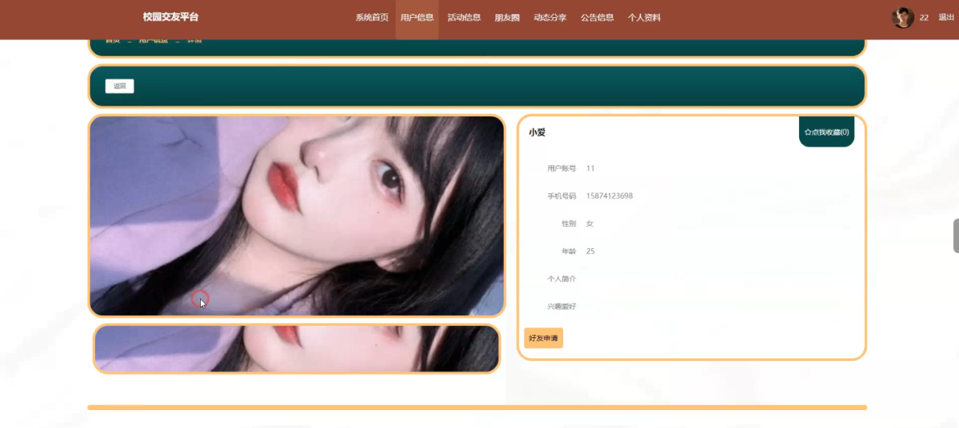 用户信息:在用户信息页面的输入栏中输入用户账号和用户姓名进行查询,可以查看到用户信息详情,并根据需要进行好友申请或收藏操作;用户信息页面如图5-2所示: