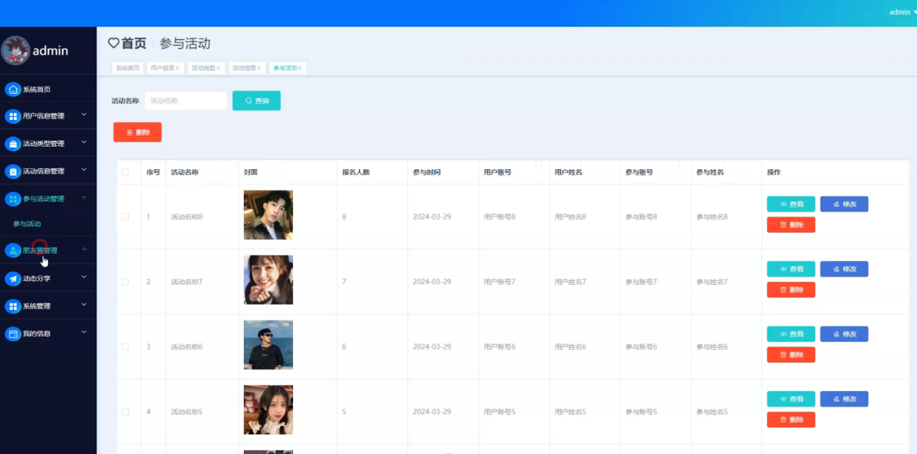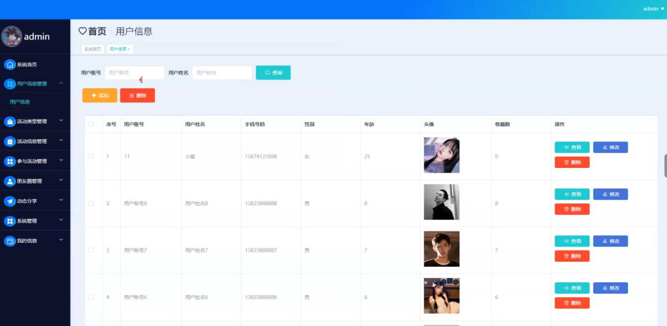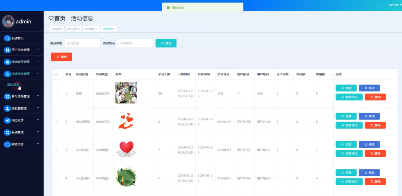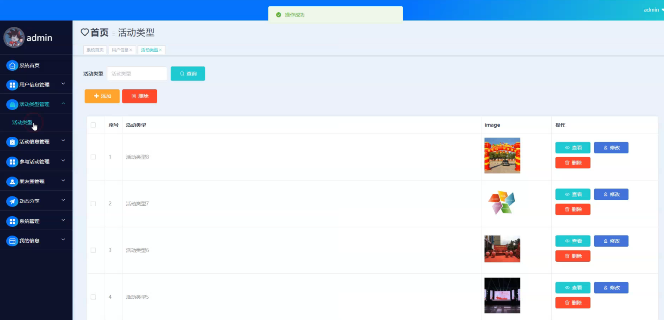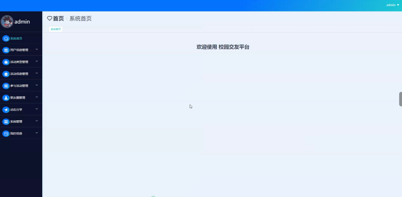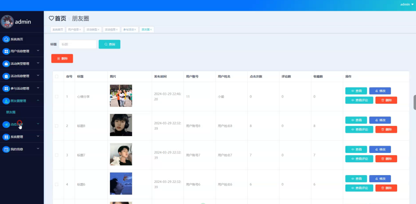 管理员进入主页面,主要功能包括对用户信息管理、活动类型管理、活动信息管理、参与活动管理、朋友圈管理、动态分享、系统管理、我的信息等进行操作。管理员主界面如图5-6所示: