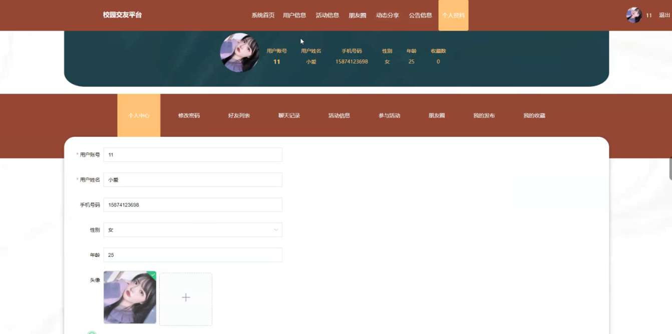 个人资料:在个人资料页面可以对个人中心、修改密码、好友列表、聊天记录、活动信息、参与活动、朋友圈、我的发布、我的收藏进行详细操作;如图5-4所示: