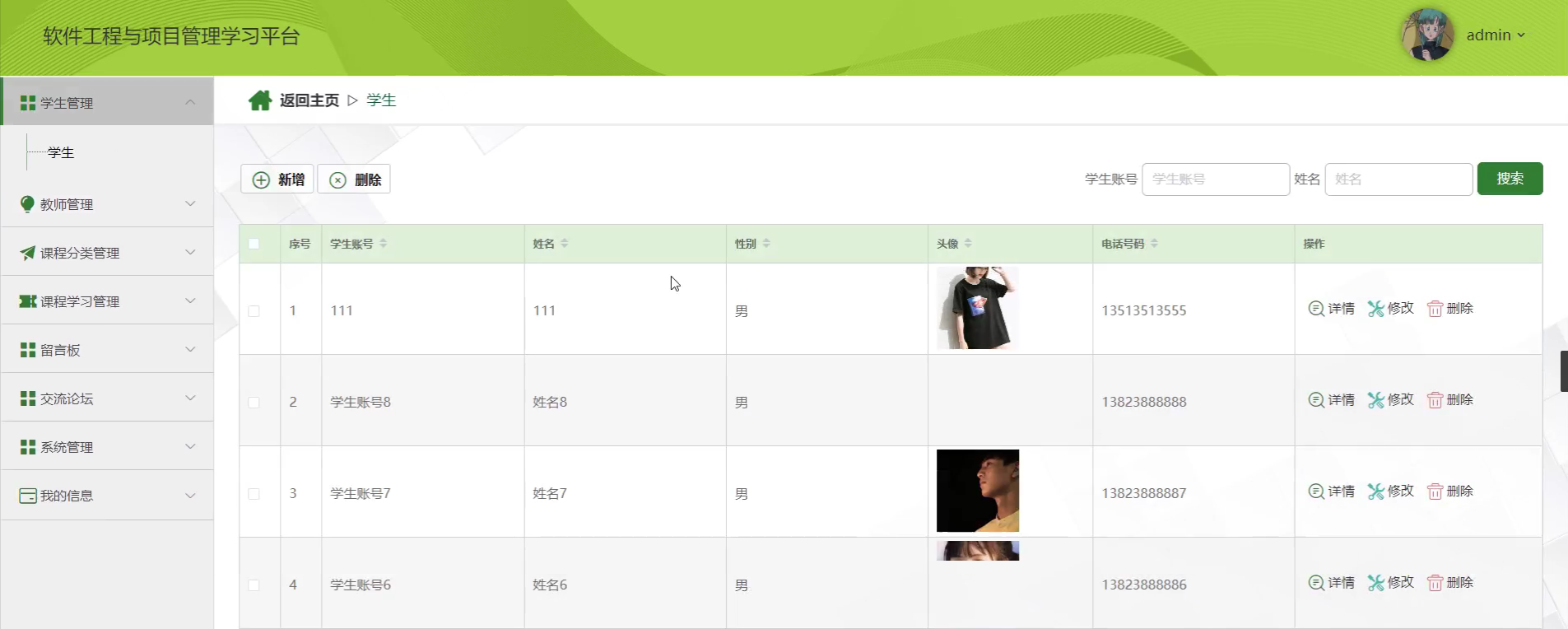 管理员点击学生管理,在学生页面输入学生账号和姓名进行搜索、新增或删除学生列表,并根据需要对学生详情信息进行详情、修改或删除操作;如图5-8所示: