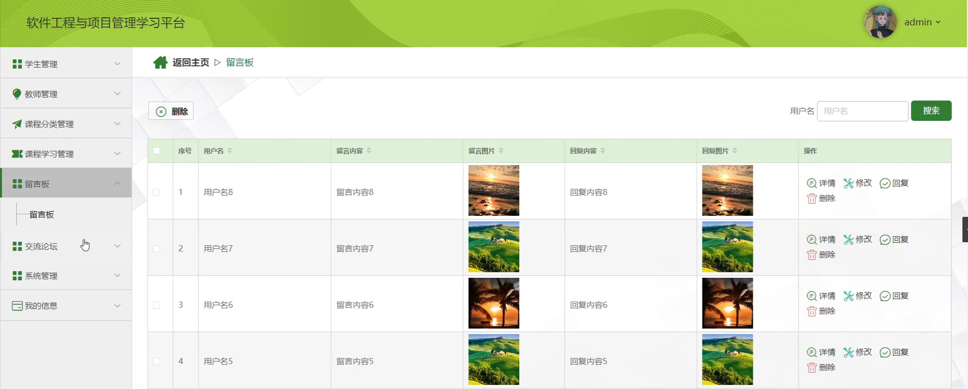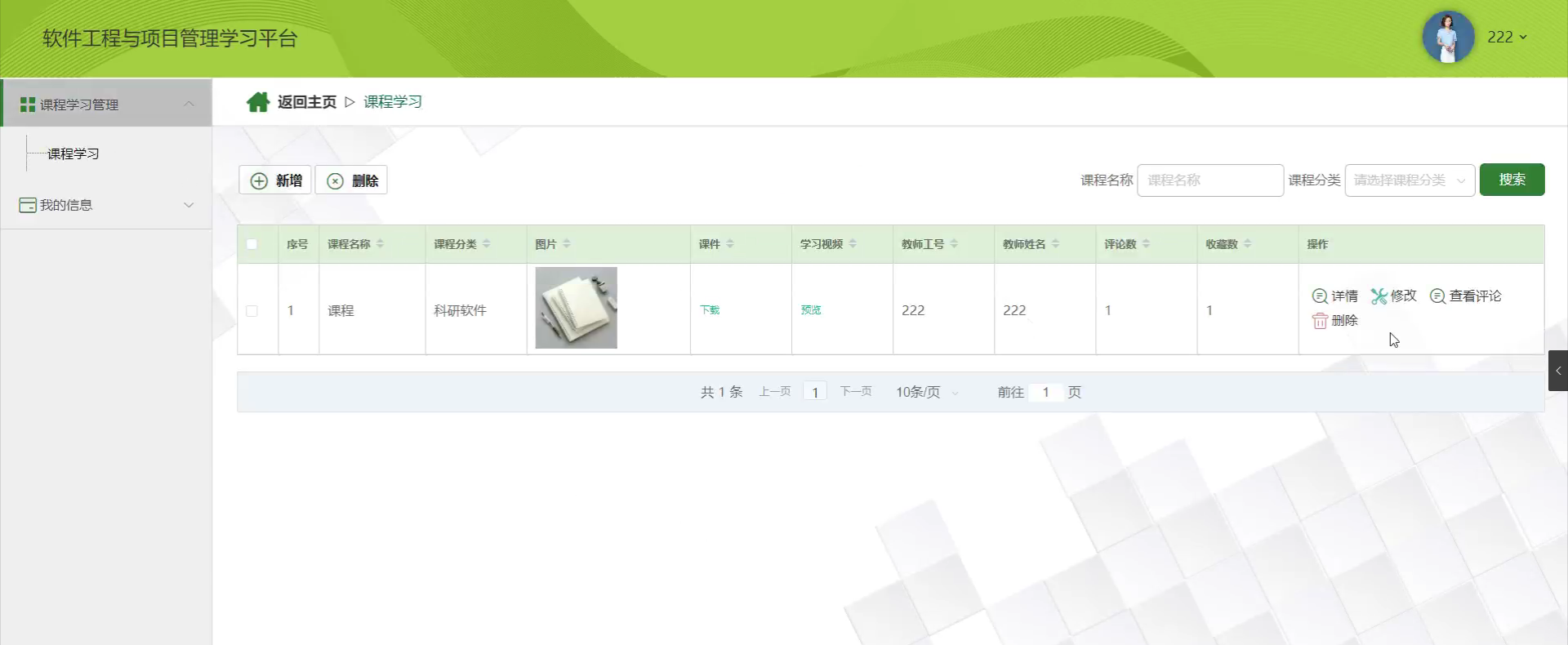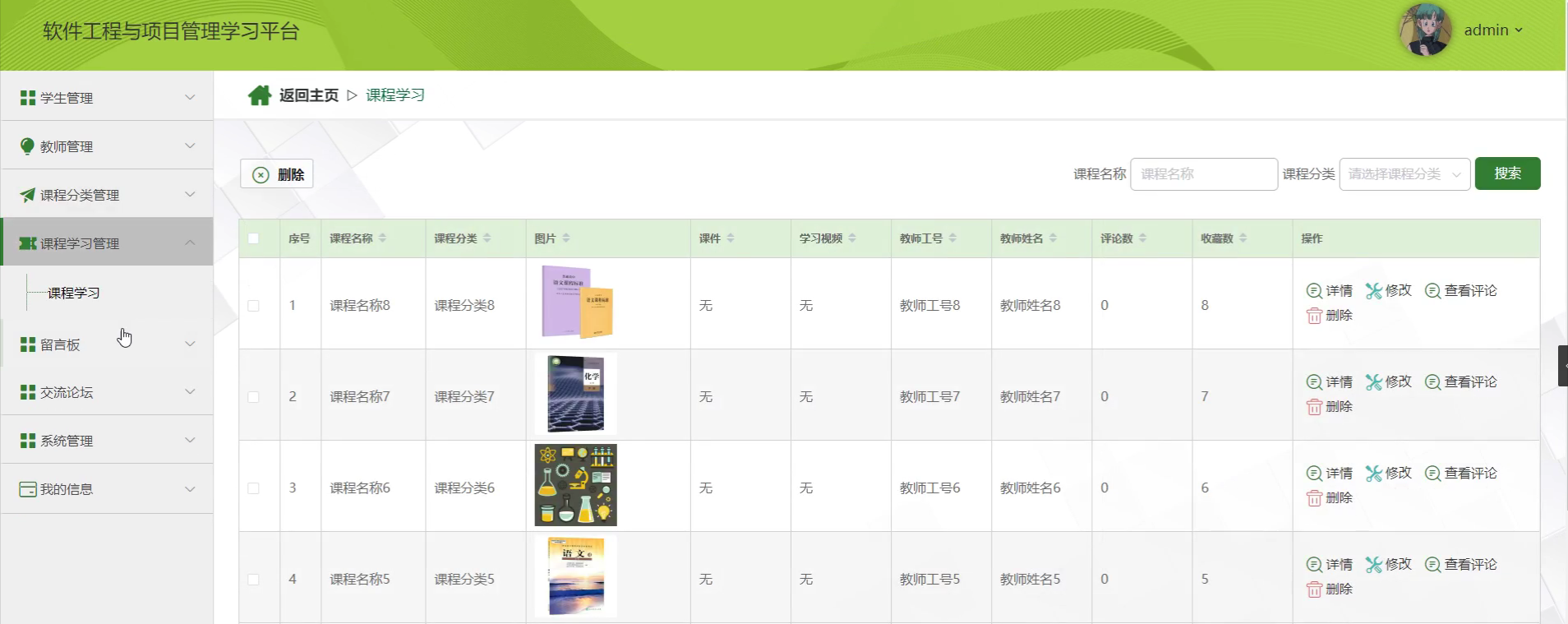 教师点击课程学习管理管理,在课程学习管理页面输入课程名称和选择课程分类进行搜索、新增或删除课程学习列表,并根据需要对课程学习详情信息进行详情、更新、查看评论或删除操作;如图5-15所示: