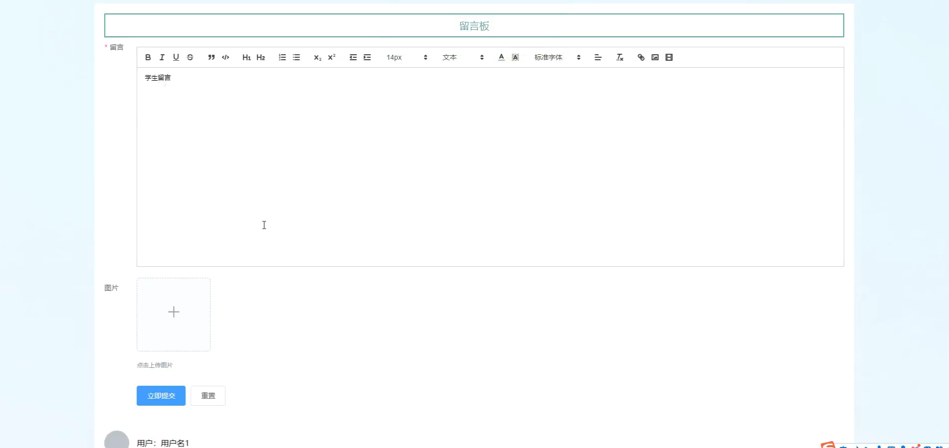 留言板:在留言板页面通过输入留言内容,上传图片并立即提交进行在线留言,还可以对留言内容进行回复操作;留言板页面如图5-4所示: