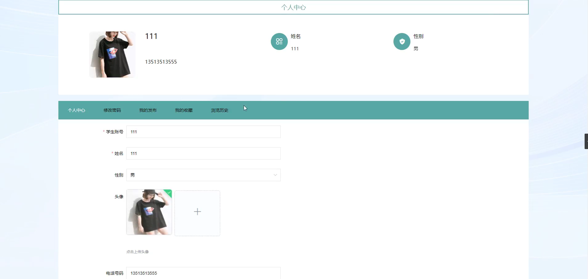 个人中心:在个人中心页面可以对个人中心、修改密码、我的发布、我的收藏、浏览历史进行详细操作;如图5-5所示: