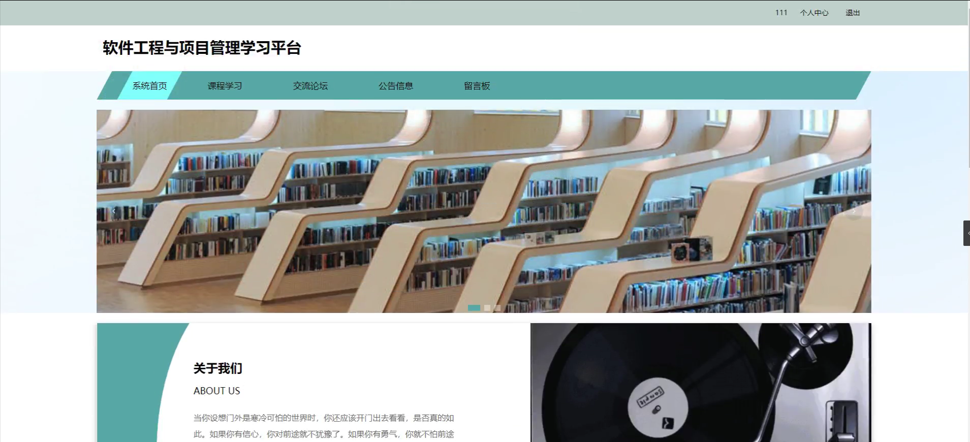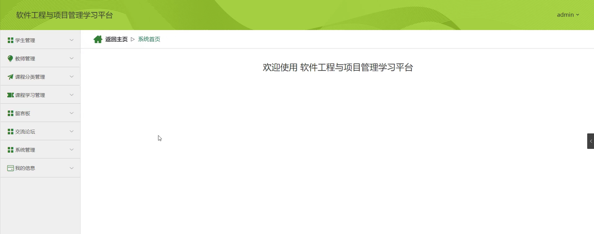 随着信息技术的迅猛发展和项目管理在各行各业中的广泛应用,对软件工程与项目管理专业人才的需求日益增长。为了适应这种需求,一个综合性的软件工程与项目管理学习平台应运而生。该平台以提升用户的专业技能和知识水平为核心目标,提供了一个集课程学习、交流互动和实践操作于一体的在线环境。平台为管理员提供了强大的后台管理功能,包括学生管理、教师管理、课程分类管理等,确保了系统运行的高效性和安全性。教师用户则能够通过平台进行课程内容的更新和管理,以及跟踪学生的学习进度。对于学生而言,平台不仅提供了大量的学习资源,如视频讲座、文档资料等,还设有交流论坛和留言板,方便学生之间及师生之间的沟通交流,促进了知识的共享和问题的及时解决。平台的公告信息板块及时发布最新的系统消息和课程动态,而个人中心则允许用户管理自己的个人信息,收藏重要内容,并查看浏览历史,使学习体验更加个性化和便捷。