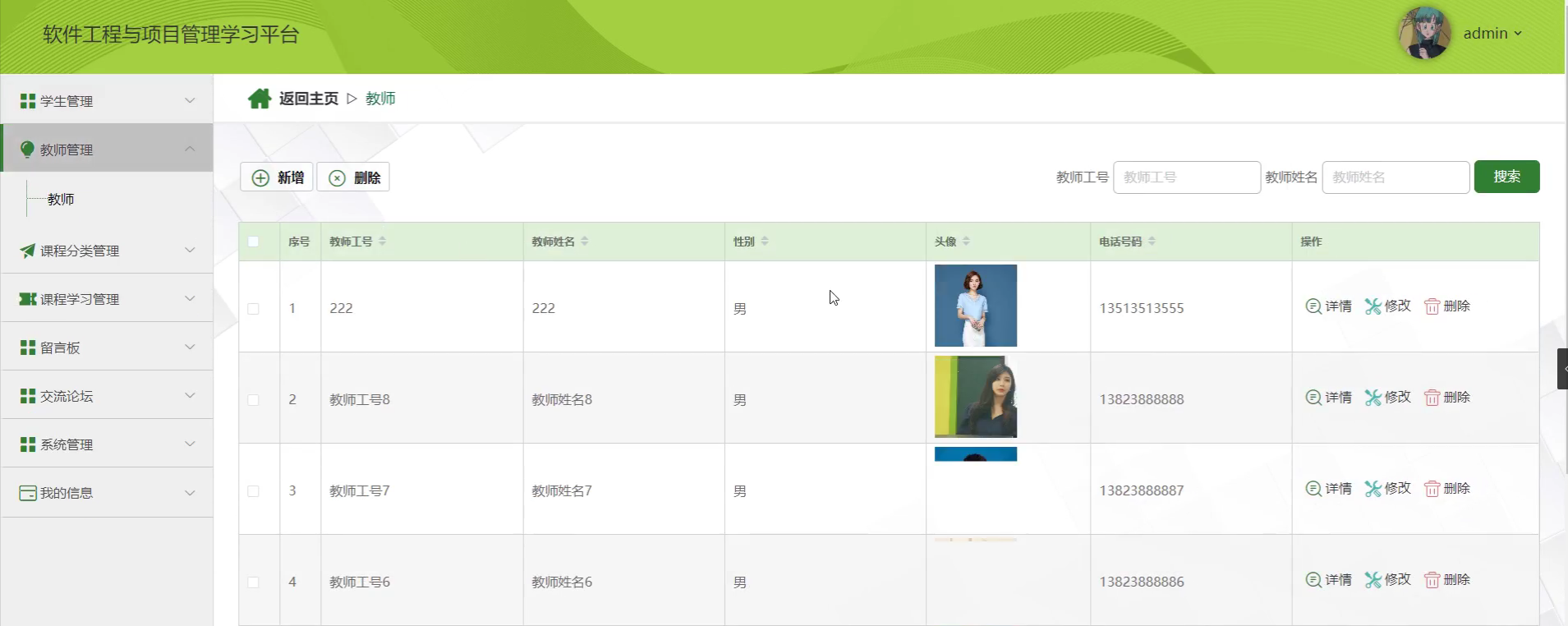 管理员点击教师管理,在教师页面输入教师工号和教师姓名进行搜索、新增或删除教师列表,并根据需要对教师详情信息进行详情、修改或删除操作;如图5-9所示: