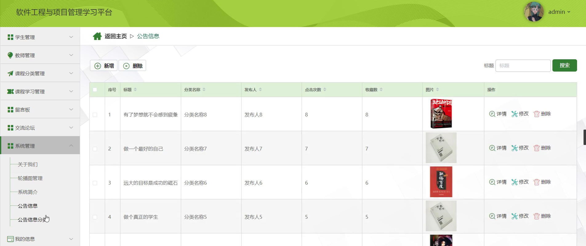 管理员点击系统管理,在公告信息页面输入标题进行搜索、新增或删除公告信息列表,并根据需要对公告详情信息进行详情、修改或删除操作,还可以对关于我们、轮播图管理、系统简介、公告信息分类等进行详细操作;如图5-13所示: