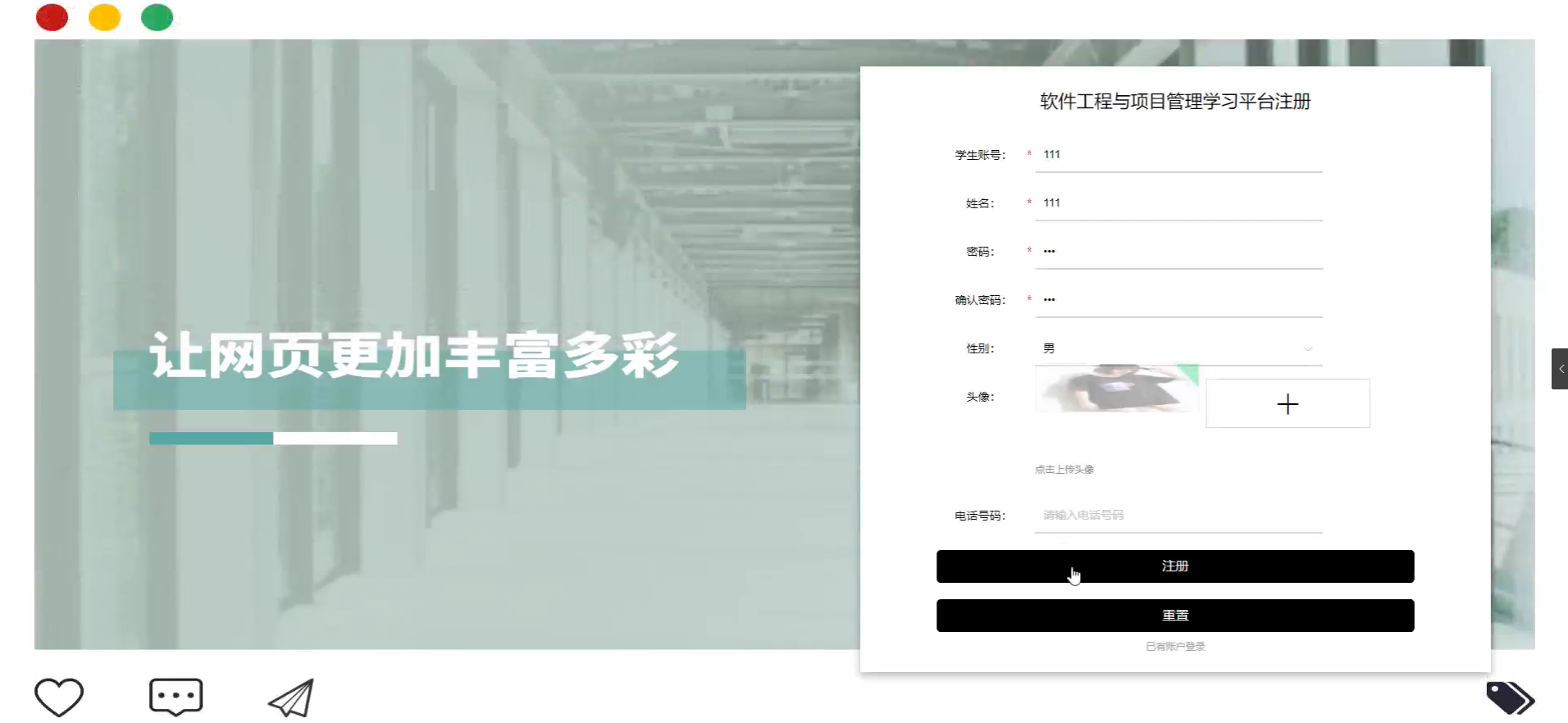 在注册流程中,用户在Vue前端填写必要信息(如用户名、密码等)并提交。前端将这些信息通过HTTP请求发送到Java后端。后端处理这些信息,检查用户名是否唯一,并将新用户数据存入MySQL数据库。完成后,后端向前端发送注册成功的确认,前端随后通知用户完成注册。这个过程实现了新用户的数据收集、验证和存储。系统注册页面如图5-2所示: