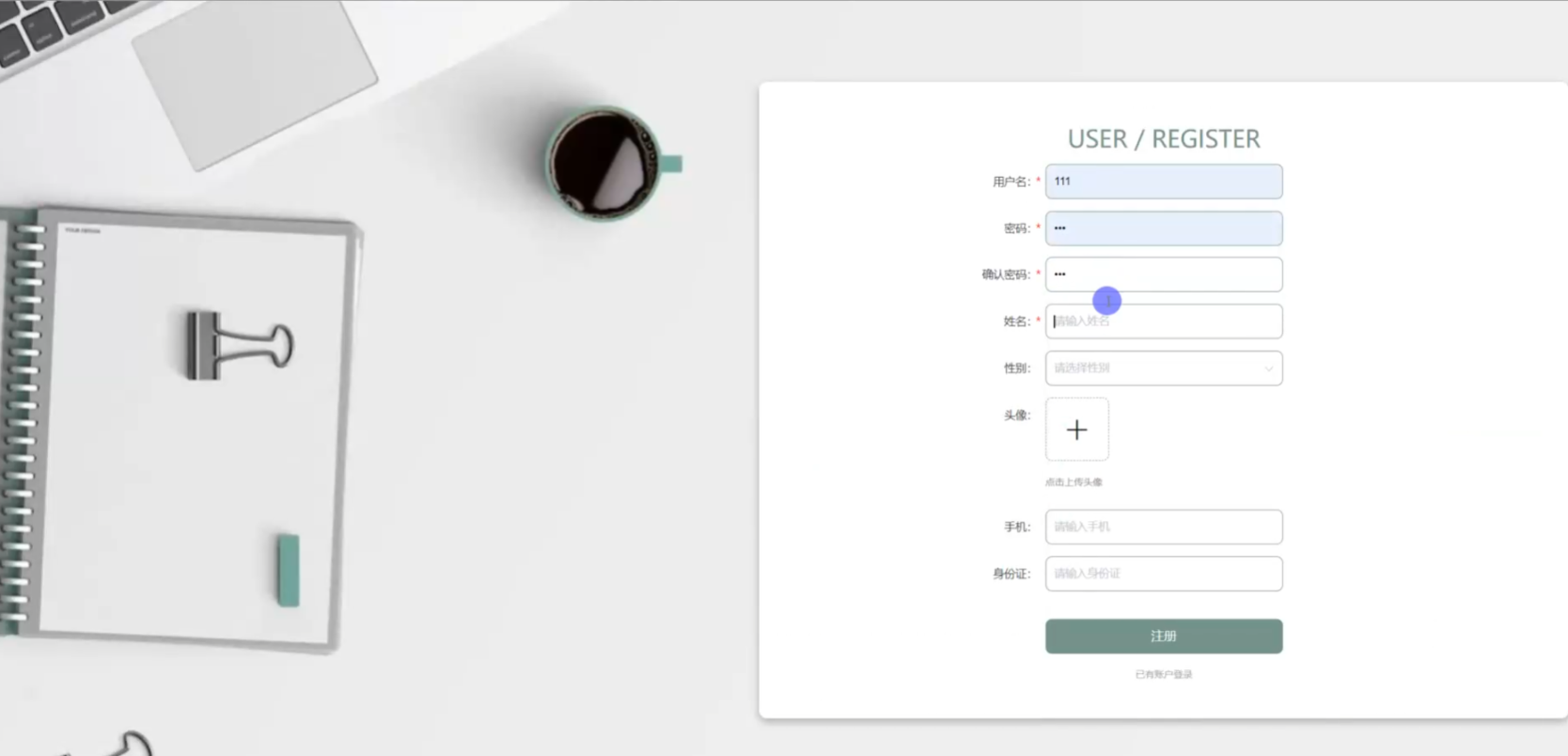 在注册流程中,用户在Vue前端填写必要信息(如用户名、密码等)并提交。前端将这些信息通过HTTP请求发送到Java后端。后端处理这些信息,检查用户名是否唯一,并将新用户数据存入MySQL数据库。完成后,后端向前端发送注册成功的确认,前端随后通知用户完成注册。这个过程实现了新用户的数据收集、验证和存储。系统注册界面如图5-2所示: