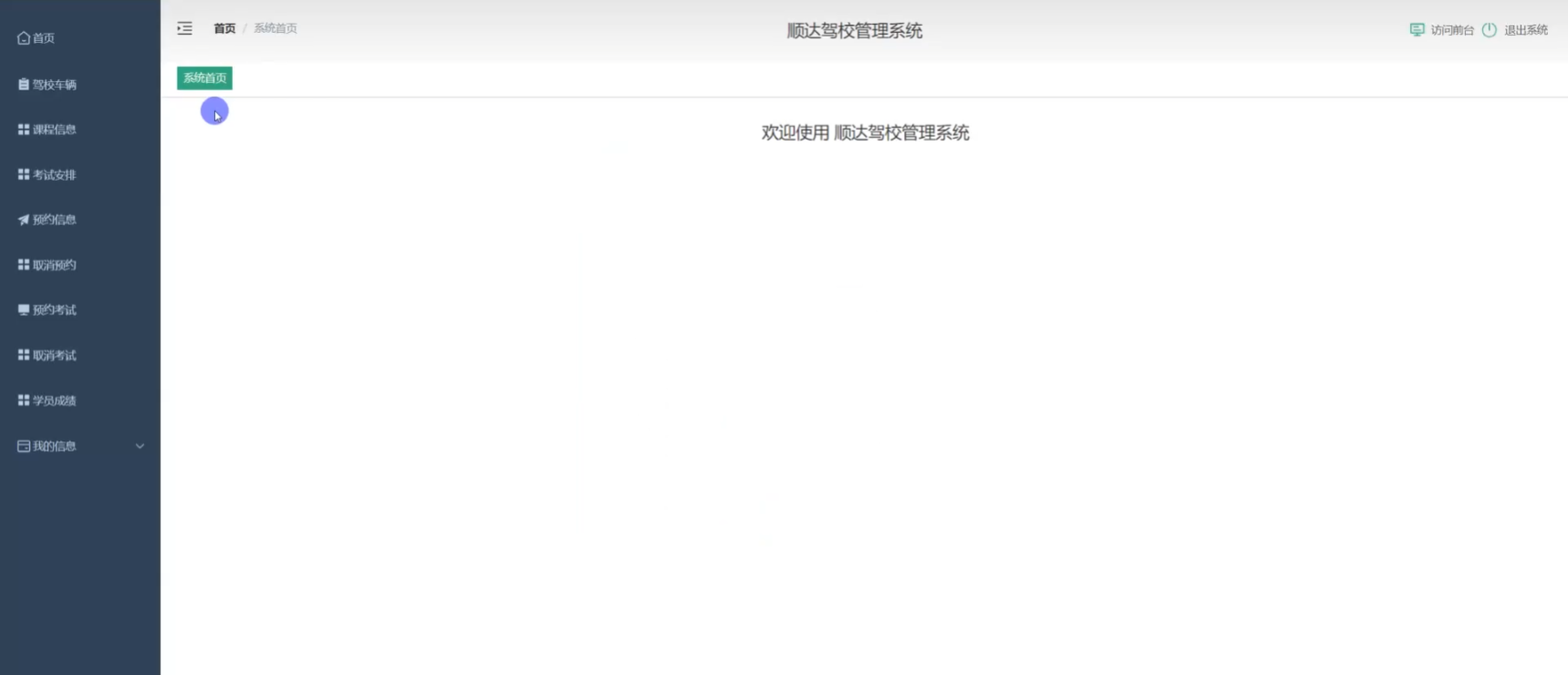教练进入主页面,主要功能包括对驾校车辆、课程信息、考试安排、预约信息、取消预约、预约考试、取消考试、学员成绩、我的信息等进行操作。教练主页面如图5-11所示: