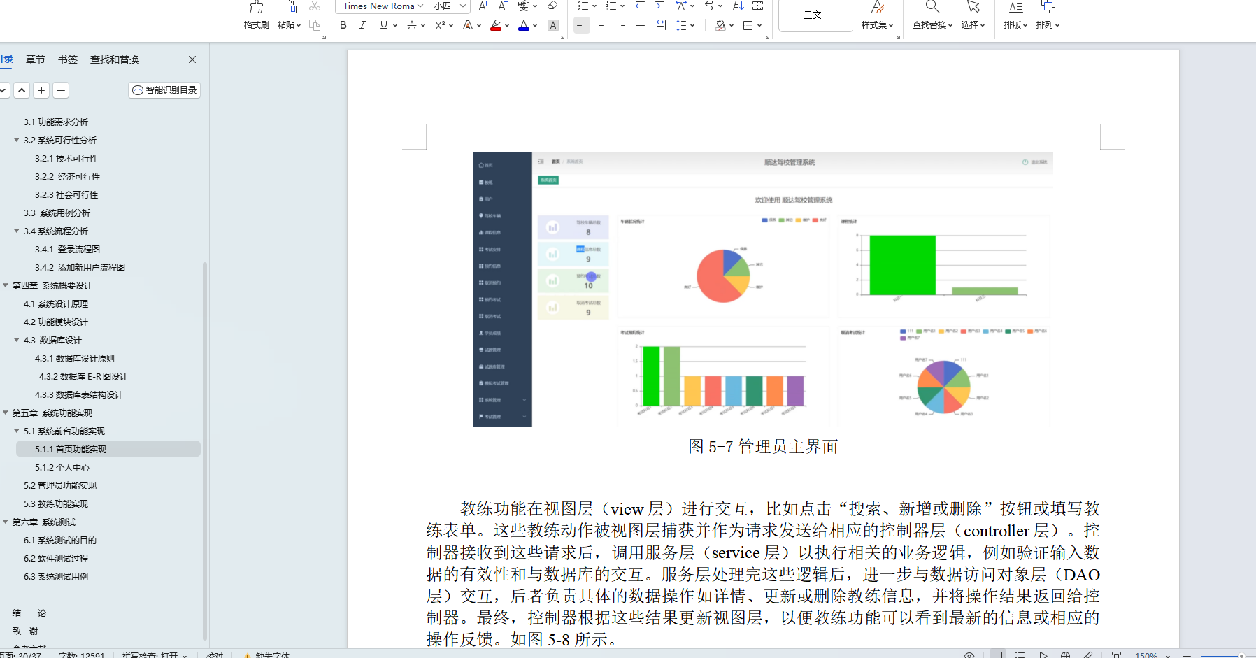 教练功能在视图层(view层)进行交互,比如点击“搜索、新增或删除”按钮或填写教练表单。这些教练动作被视图层捕获并作为请求发送给相应的控制器层(controller层)。控制器接收到这些请求后,调用服务层(service层)以执行相关的业务逻辑,例如验证输入数据的有效性和与数据库的交互。服务层处理完这些逻辑后,进一步与数据访问对象层(DAO层)交互,后者负责具体的数据操作如详情、更新或删除教练信息,并将操作结果返回给控制器。最终,控制器根据这些结果更新视图层,以便教练功能可以看到最新的信息或相应的操作反馈。如图5-8所示。