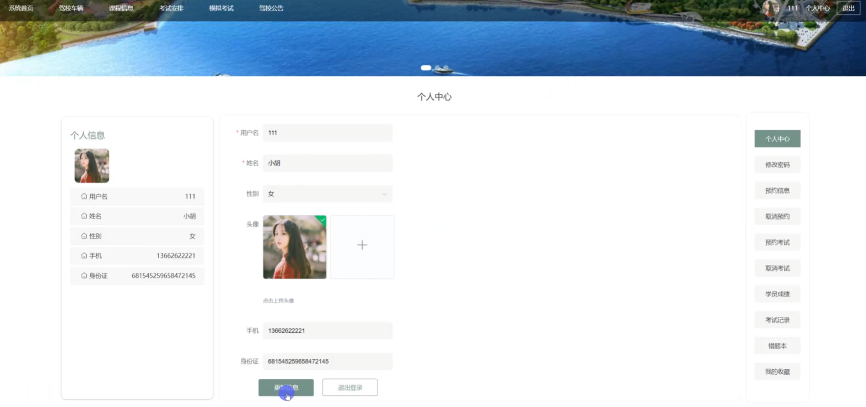 客户注册登录进入系统,点击个人中心可以个人中心、修改密码、预约信息、取消预约、预约考试、取消考试、学员成绩、考试记录、错题本、我的收藏等功能进行操作。个人中心页面如图5-5所示: