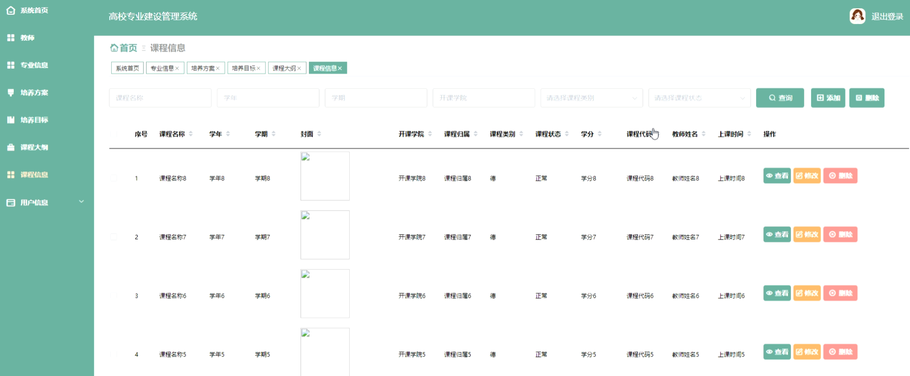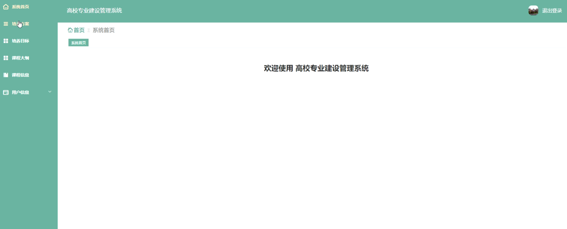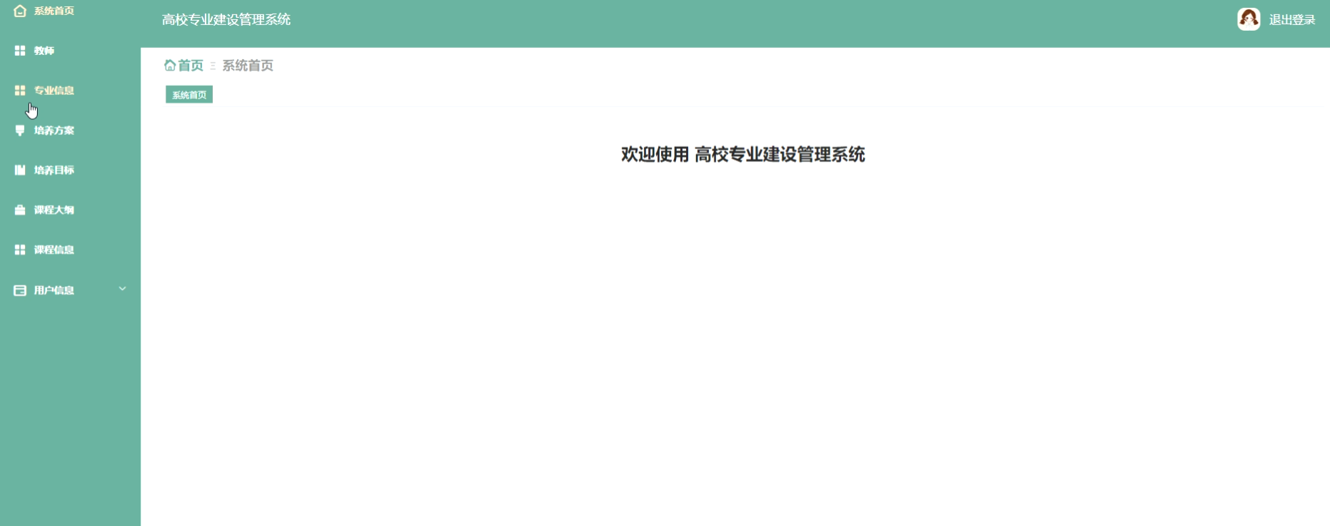 管理员进入主页面,主要功能包括对教师、专业信息、培养方案、培养目标、课程大纲、课程信息、用户信息等进行操作。如图5-3所示。