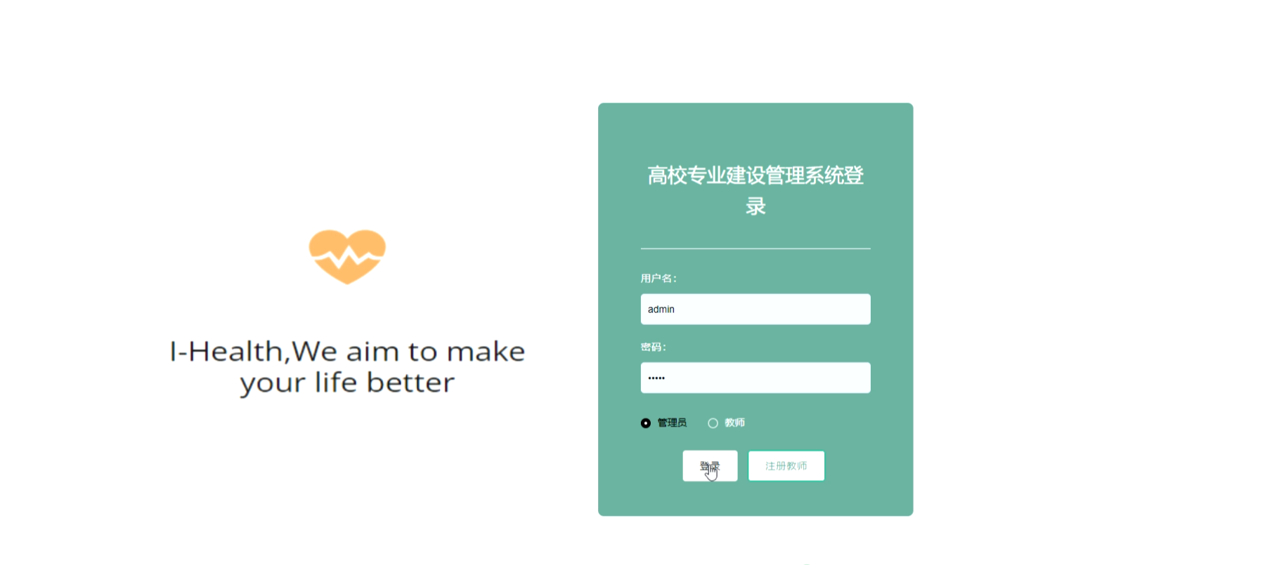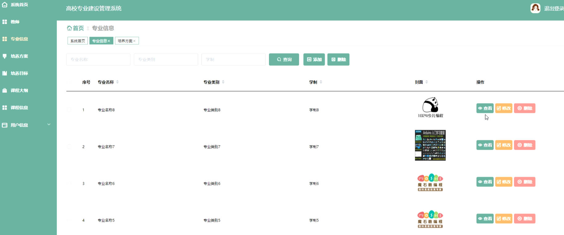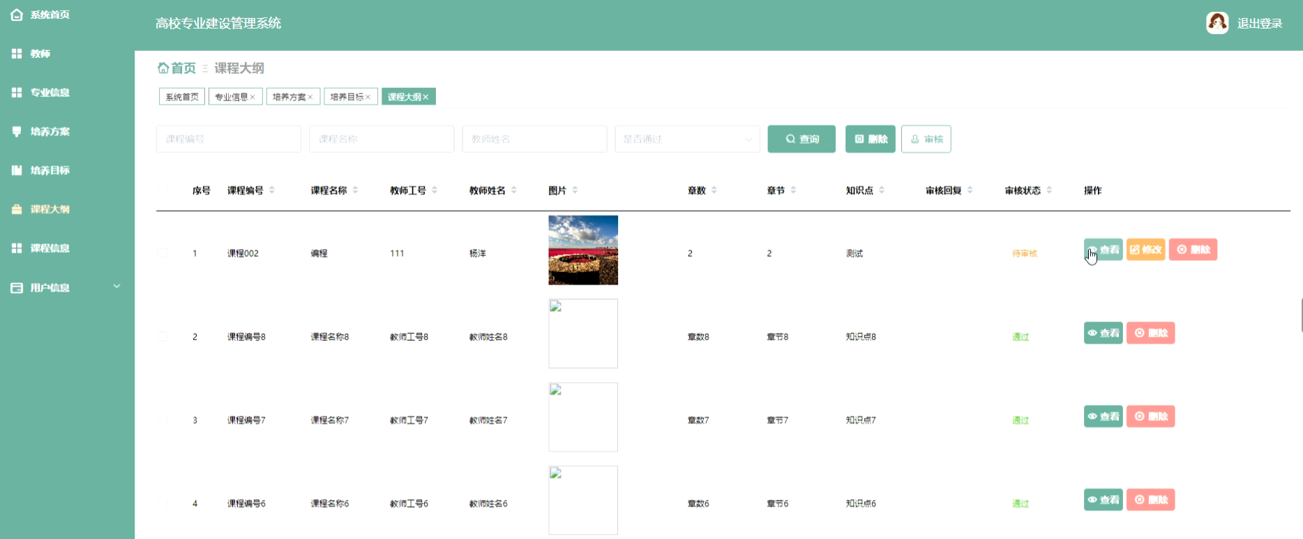 管理员进入主页面,主要功能包括对教师、专业信息、培养方案、培养目标、课程大纲、课程信息、用户信息等进行操作。如图5-3所示。