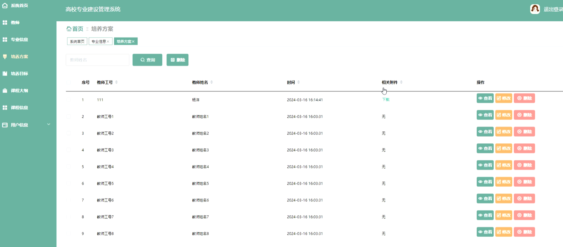 教师进入主页面,主要功能包括对培养方案、培养目标、课程大纲、课程信息、用户信息等进行操作。如图5-9所示。