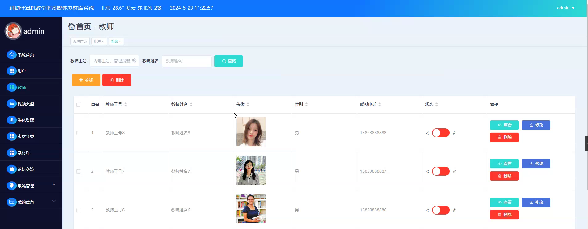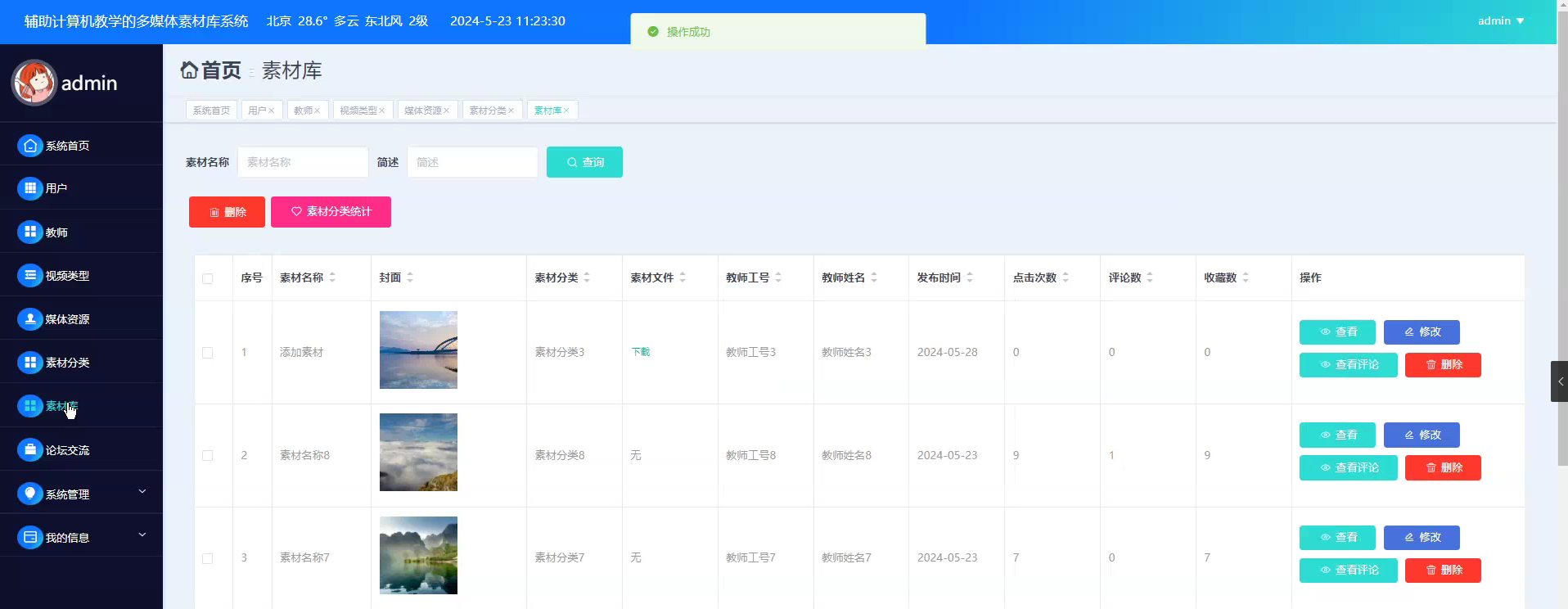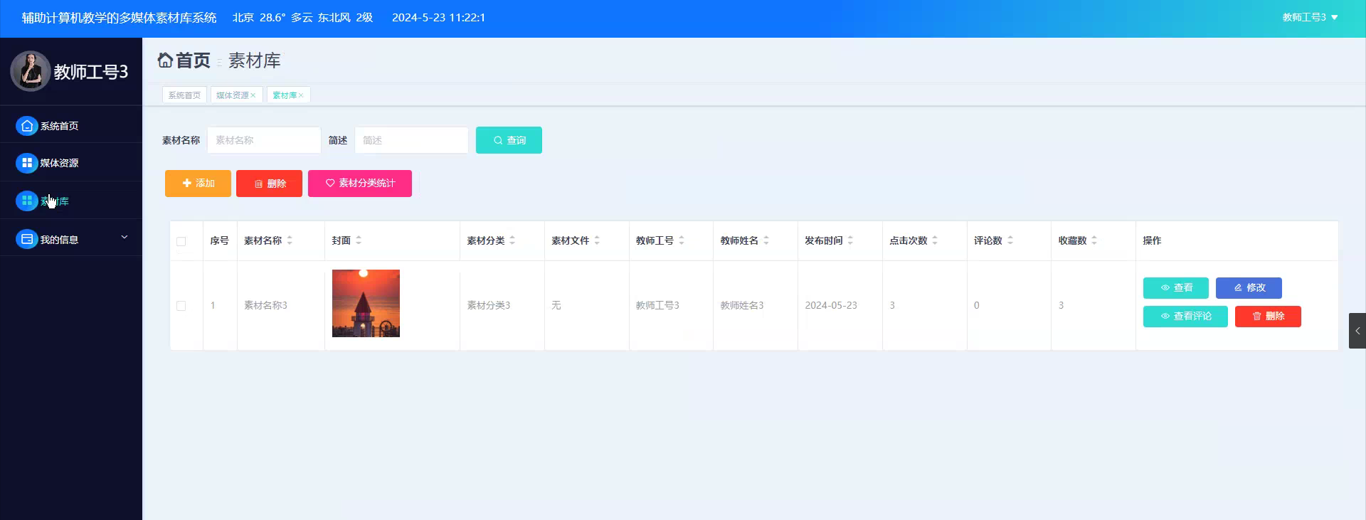 教师点击素材库,在素材库页面输入素材名称和简述进行查询、添加或删除素材库列表,点击素材分类统计进行查看统计图;并根据需要对素材库详情信息进行查看、修改、查看评论或删除操作;如图5-15所示: