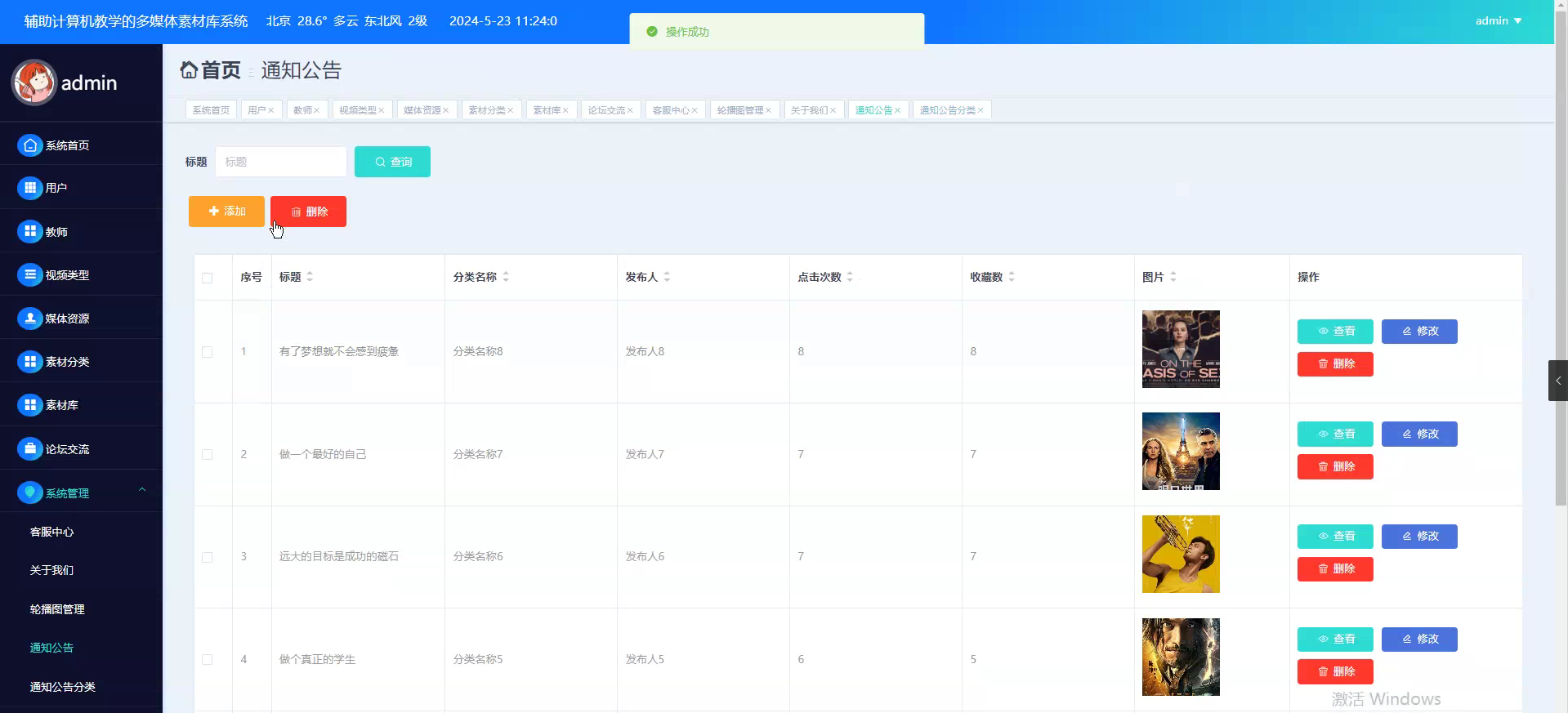 管理员点击系统管理,在通知公告页面输入标题进行查询、添加或删除通知公告列表,并根据需要对通知公告详情信息进行查看、修改或删除操作;还可以对客服中心、关于我们、轮播图管理和通知公告分类进行详细操作;如图5-12所示:
