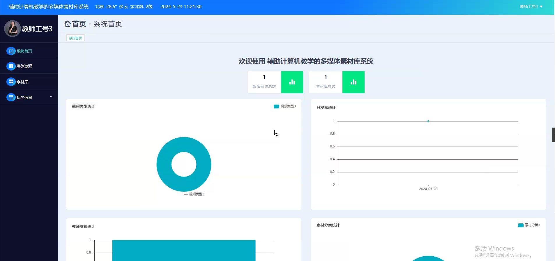 教师进入主页面,主要功能包括对系统首页、媒体资源、素材库、我的信息等进行操作。教师主页面如图5-13示: