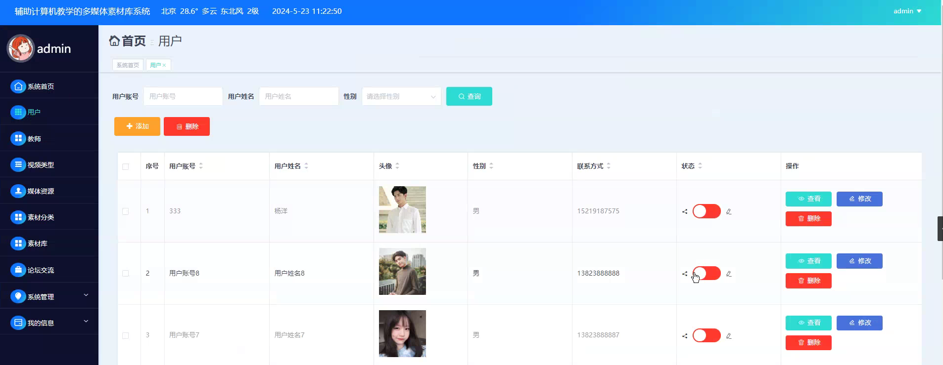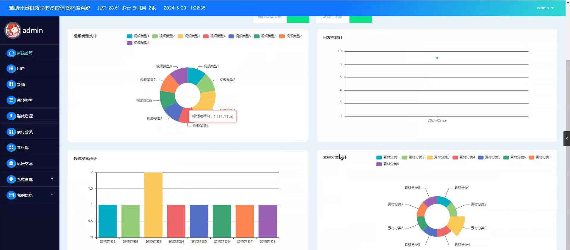 如图像、音频、视频及文本等。通过高效的分类和管理功能,用户可以轻松地找到所需的素材,并将其集成到教学活动中去,极大地丰富了教学内容和形式。同时,系统还提供了论坛交流和通知公告等功能,加强了师生之间的互动与沟通,促进了教学信息的有效传递。个人中心允许用户管理个人信息和收藏的素材,增加了系统的个性化体验。管理员则拥有更全面的管理权限,包括用户管理、系统设置等,确保系统的顺畅运行。整体而言,多媒体素材库系统为现代计算机辅助教学提供了强有力的支持,使得教育资源更加生动、便捷和高效。