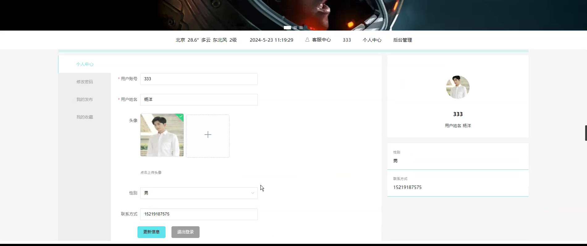 个人中心,在个人中心页面可以对个人中心、修改密码、我的发布、我的收藏等功能进行操作;如图5-5所示: