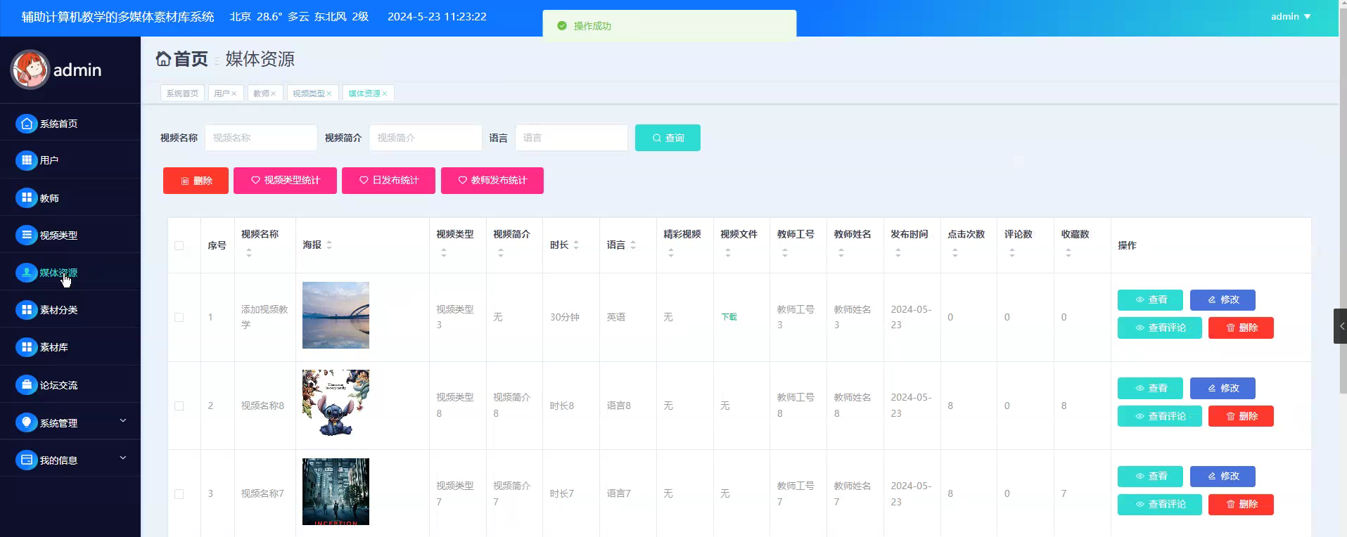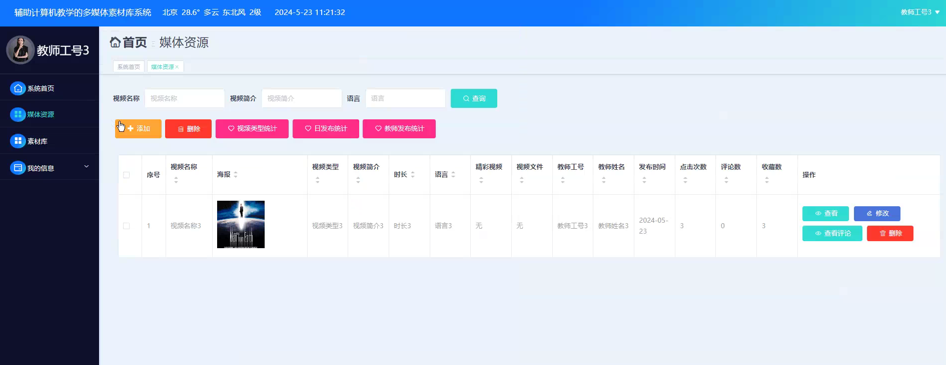 教师点击媒体资源,在媒体资源页面输入视频名称、视频简介和语言进行查询、添加或删除媒体资源列表,点击视频类型统计、日发布统计、教师发布统计进行查看统计图;并根据需要对媒体资源详情信息进行查看、修改、查看评论或删除操作;如图5-14所示: