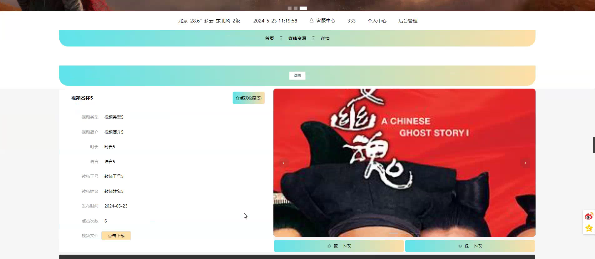 媒体资源:在媒体资源页面的输入栏中输入视频名称、视频简介和语言进行查询,可以查看到媒体资源详细信息,并进行评论或收藏操作;媒体资源页面如图5-3所示: