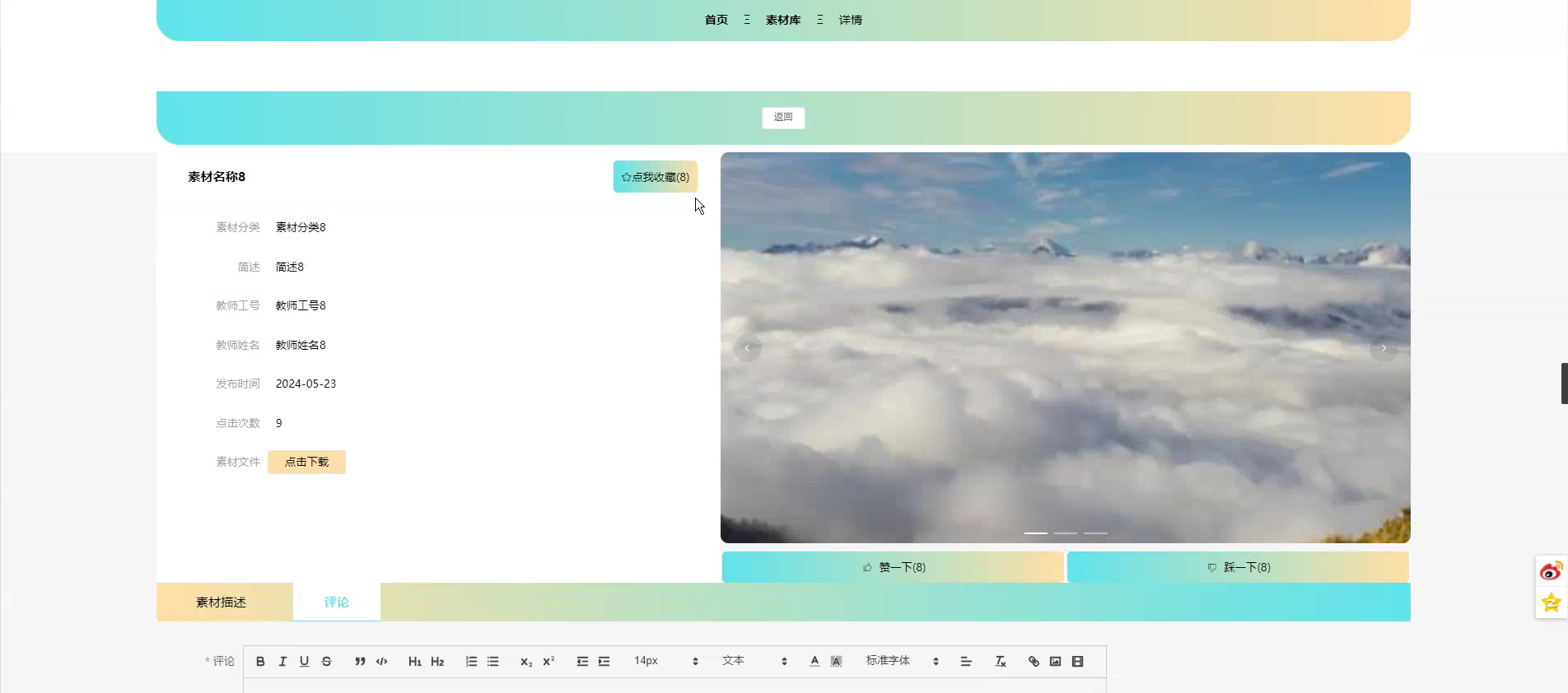 素材库:在素材库页面的输入栏中输入素材名称和简述进行查询,可以查看到素材库详细信息,并进行评论或收藏操作;素材库页面如图5-4所示:
