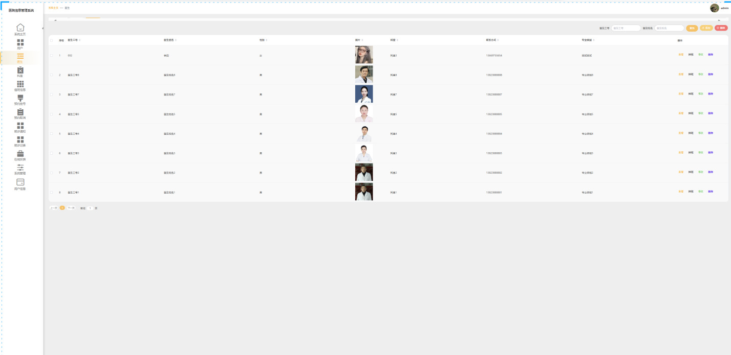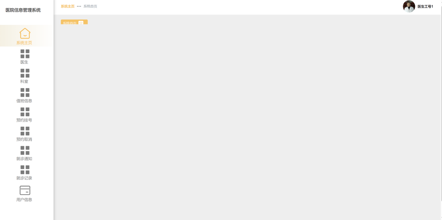 医生进入主页面,主要功能包括对医生、科室、值班信息、预约挂号、预约取消、就诊通知、就诊记录、用户信息等进行操作。医生主页面如图4-15所示: