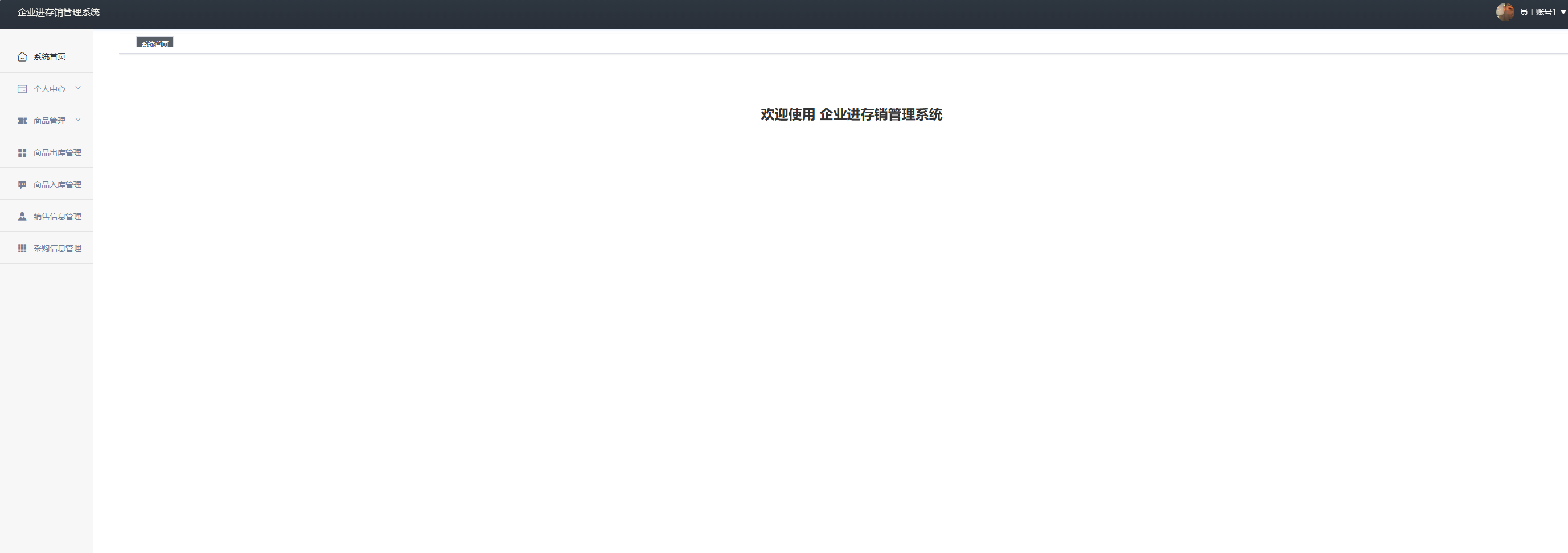 员工进入主页面,主要功能包括对个人中心、商品管理、商品出库管理、商品入库管理、销售信息管理、采购信息管理等进行操作。如图5-9所示。