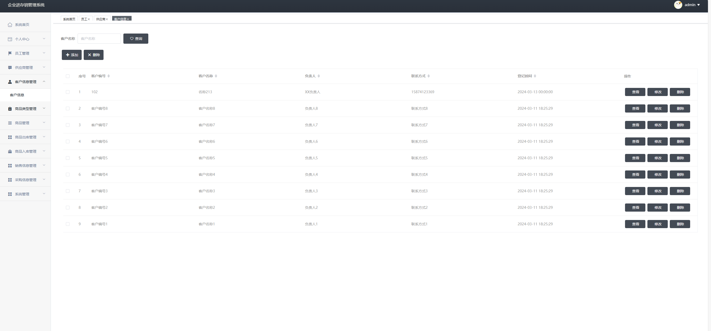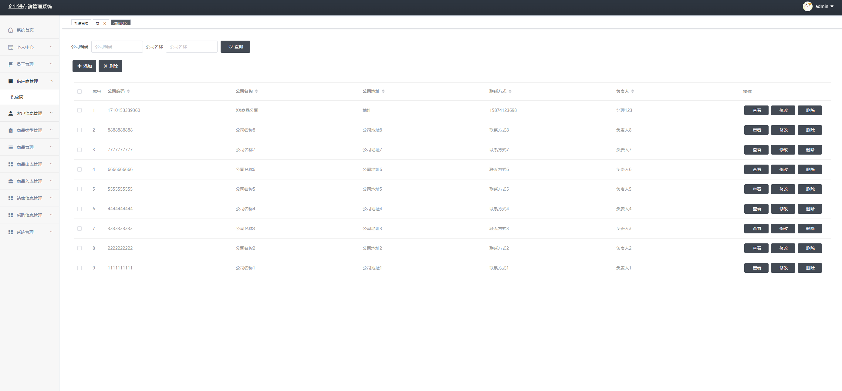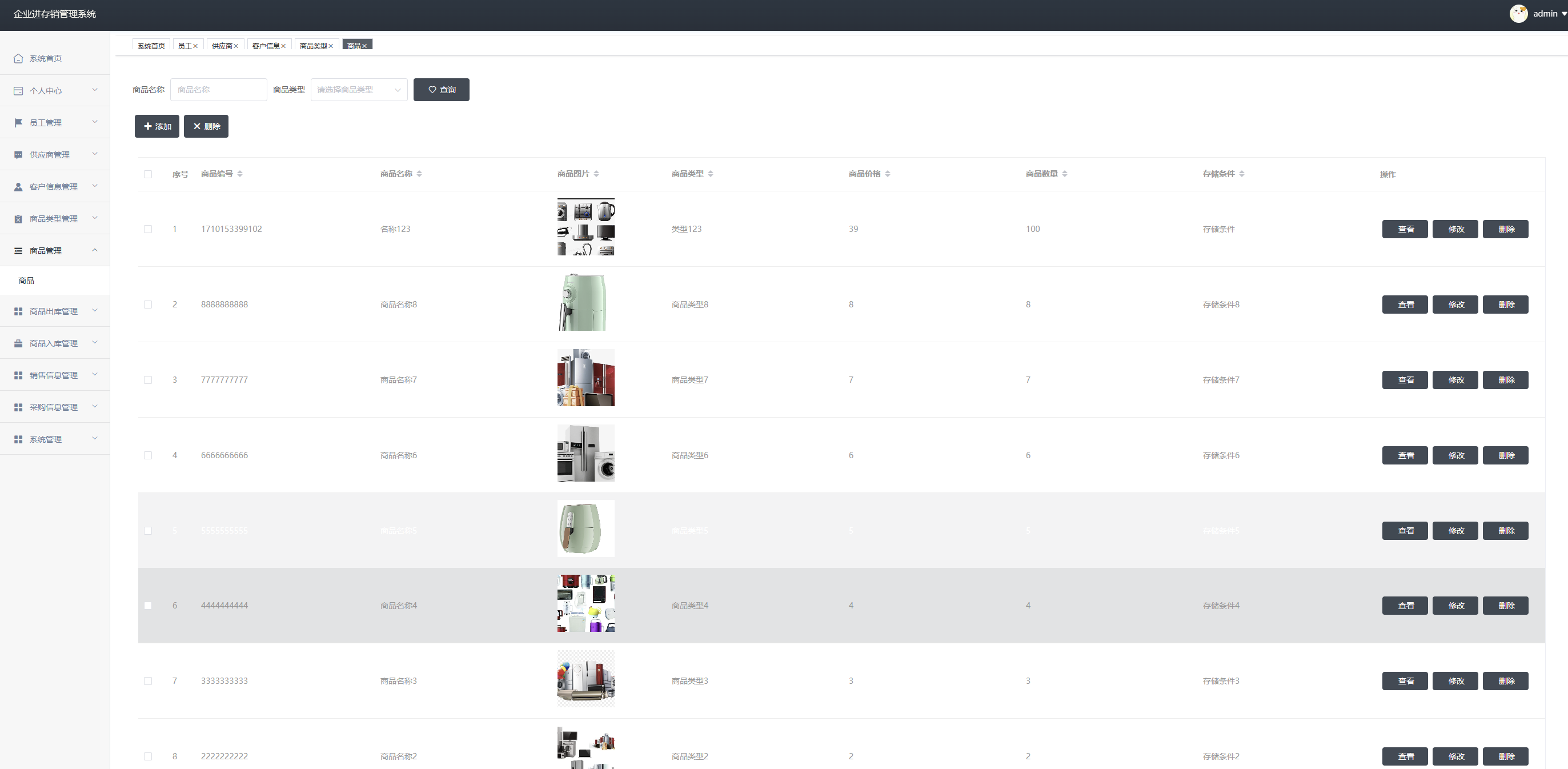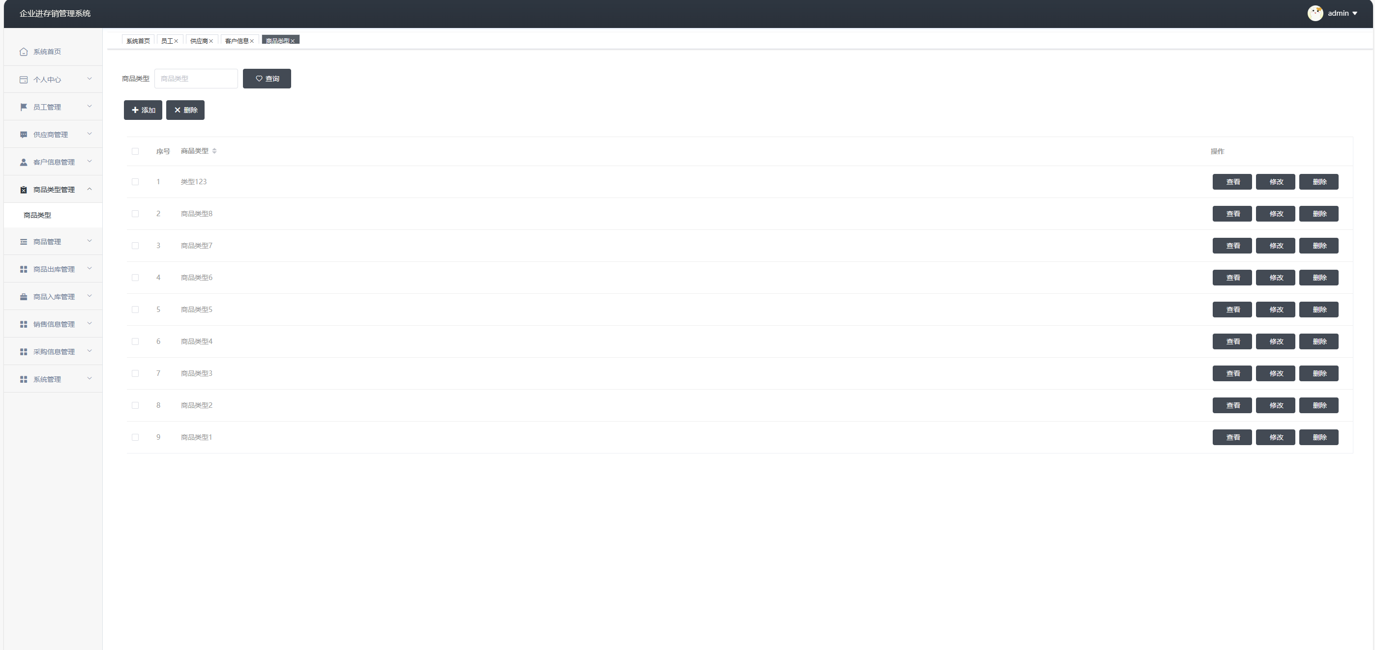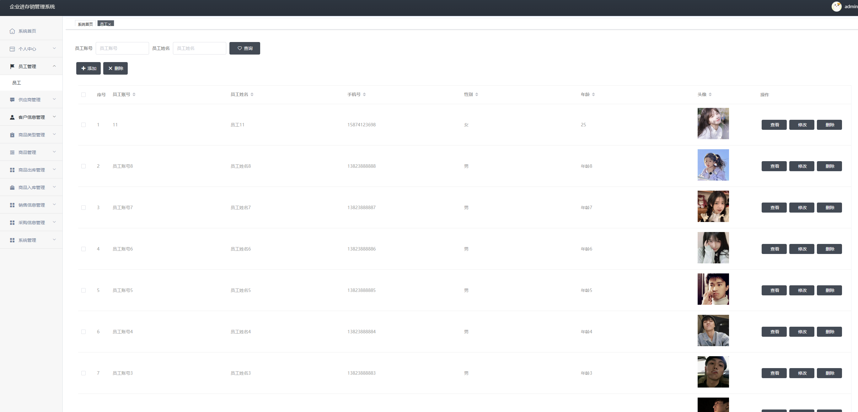 管理员进入主页面,主要功能包括对个人中心、员工管理、供应商管理、客户信息管理、商品类型管理、商品管理、商品出库管理、商品入库管理、销售信息管理、采购信息管理、系统管理等进行操作。如图5-3所示。