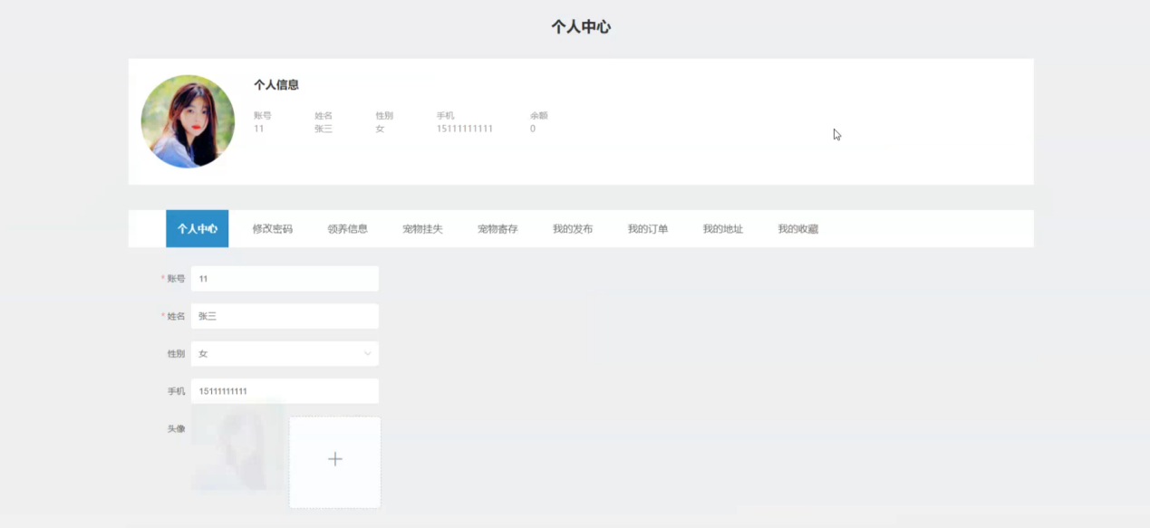 个人中心:在个人中心页面可以对个人中心、修改密码、领养信息、宠物挂失、宠物寄存、我的发布、我的订单、我的地址、我的收藏进行详细操作;如图5-4所示: