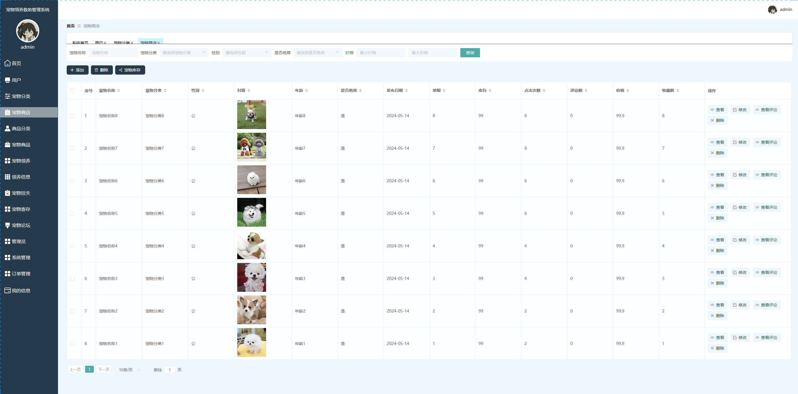 宠物商店功能在视图层(view层)进行交互,比如点击“查询、添加或删除”按钮或填写宠物商店信息表单。这些宠物商店信息表单动作被视图层捕获并作为请求发送给相应的控制器层(controller层)。控制器接收到这些请求后,调用服务层(service层)以执行相关的业务逻辑,例如验证输入数据的有效性和与数据库的交互。服务层处理完这些逻辑后,进一步与数据访问对象层(DAO层)交互,后者负责具体的数据操作如查看、修改或删除宠物商店信息,并将操作结果返回给控制器。最终,控制器根据这些结果更新视图层,以便宠物商店功能可以看到最新的信息或相应的操作反馈。宠物商店界面如图5-9所示: