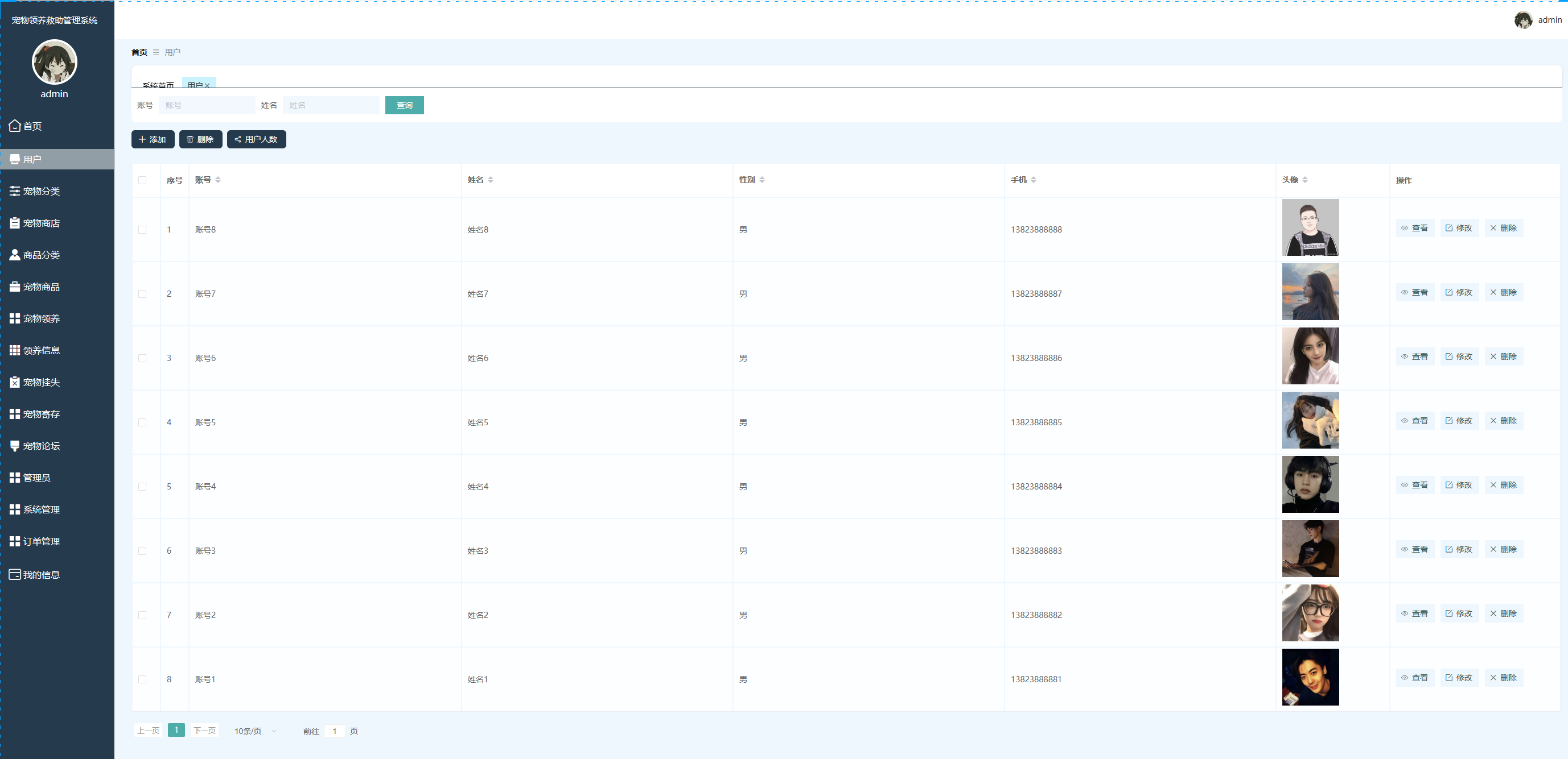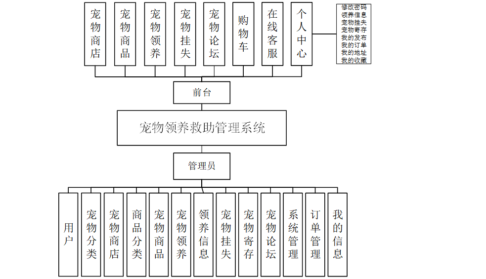 管理员进入主页面,主要功能包括对用户、宠物分类、宠物商店、商品分类、宠物商品、宠物领养、领养信息、宠物挂失、宠物寄存、宠物论坛、系统管理、订单管理、我的信息等进行操作。管理员主页面如图5-6所示: