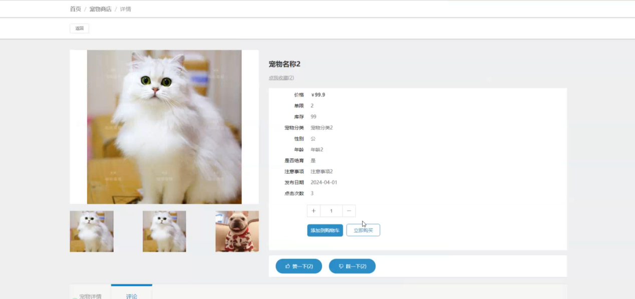 宠物商店:在宠物商店页面的输入栏中输入宠物名称或价格进行查询,可以查看到宠物商店详情信息,并进行点赞、添加到购物车、评论或立即购买操作;宠物商店页面如图5-3所示: