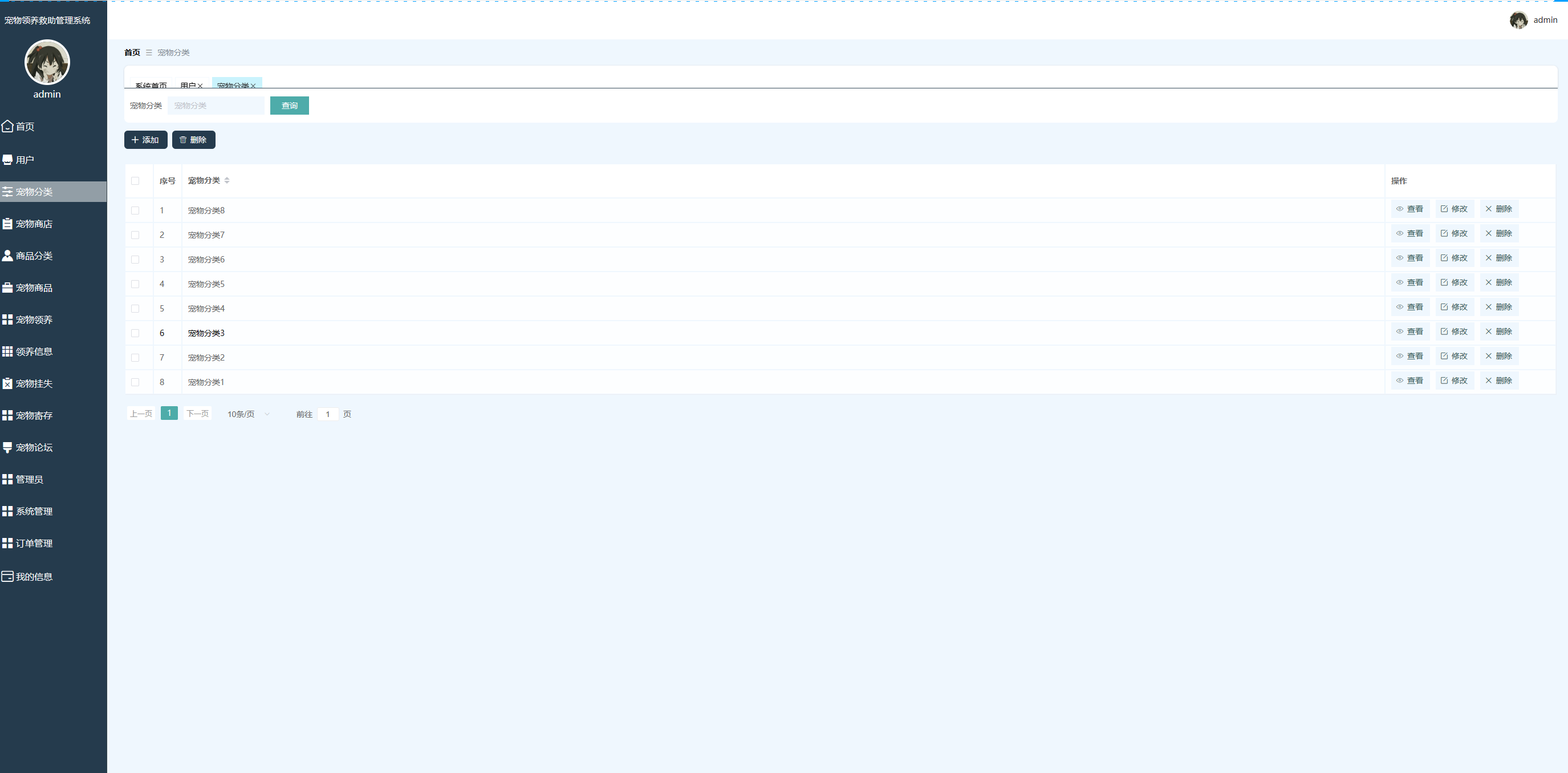 宠物分类功能在视图层(view层)进行交互,比如点击“查询、添加或删除”按钮或填写宠物分类表单。这些宠物分类表单动作被视图层捕获并作为请求发送给相应的控制器层(controller层)。控制器接收到这些请求后,调用服务层(service层)以执行相关的业务逻辑,例如验证输入数据的有效性和与数据库的交互。服务层处理完这些逻辑后,进一步与数据访问对象层(DAO层)交互,后者负责具体的数据操作如查看、修改或删除宠物分类信息,并将操作结果返回给控制器。最终,控制器根据这些结果更新视图层,以便宠物分类功能可以看到最新的信息或相应的操作反馈。宠物分类界面如图5-8所示: