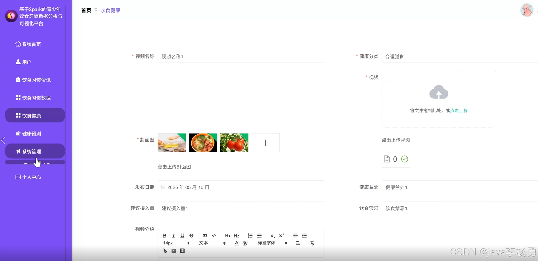 随着社会对青少年健康问题的日益关注,饮食习惯作为影响青少年身心发展的重要因素,亟需通过技术手段进行科学管理与指导。本文设计并实现了一套基于Spark的大数据分析与可视化平台,专注于青少年饮食习惯数据的收集、分析与智能推荐。系统分为用户端和管理员端,用户端提供资讯浏览、饮食记录、健康建议、智能AI助手等功能,提升用户参与感与健康意识;管理员端支持用户管理、饮食数据分析、预测建模和系统维护等操作,实现对平台数据的高效管理与可视化展示。系统采用Spark处理框架提升数据处理效率,结合可视化技术增强数据解读能力,为青少年群体提供科学、个性化的饮食健康管理服务,具有良好的应用前景与实践价值。