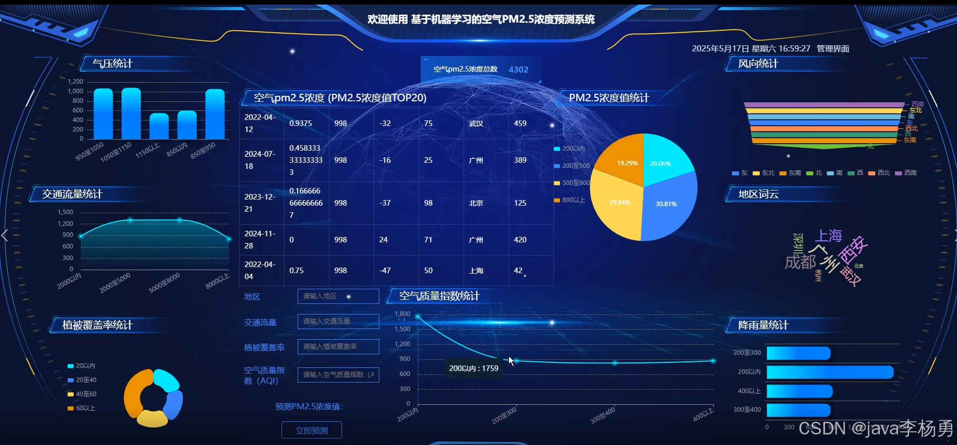 随着我国工业化和城镇化的快速发展,以PM2.5为代表的细颗粒物污染已成为危害公众健康和影响生活质量的突出环境问题。PM2.5浓度受工业生产、交通排放、气象条件及地理环境等多重复杂因素交织影响,其时空变化规律难以通过传统方法准确把握。当前,环境监测站点虽能提供实时数据,但存在点位有限、分析滞后、预测能力不足等局限,无法满足公众对高精度空气质量预报和政府部门进行科学溯源、精准治污的迫切需求。