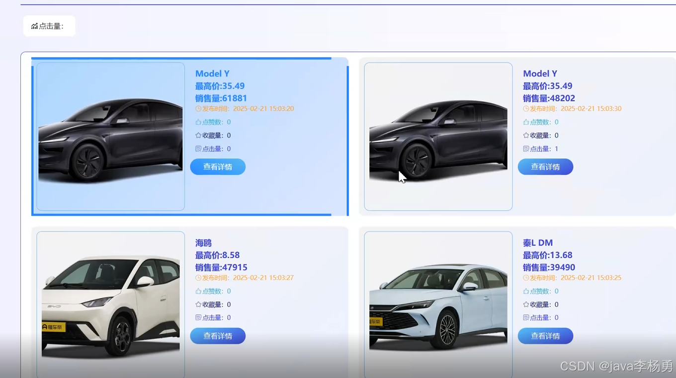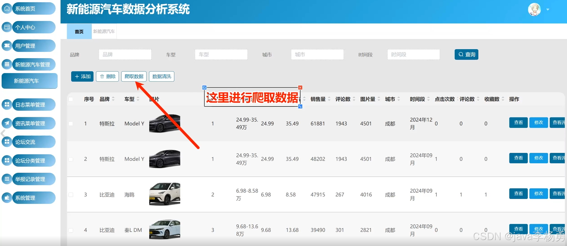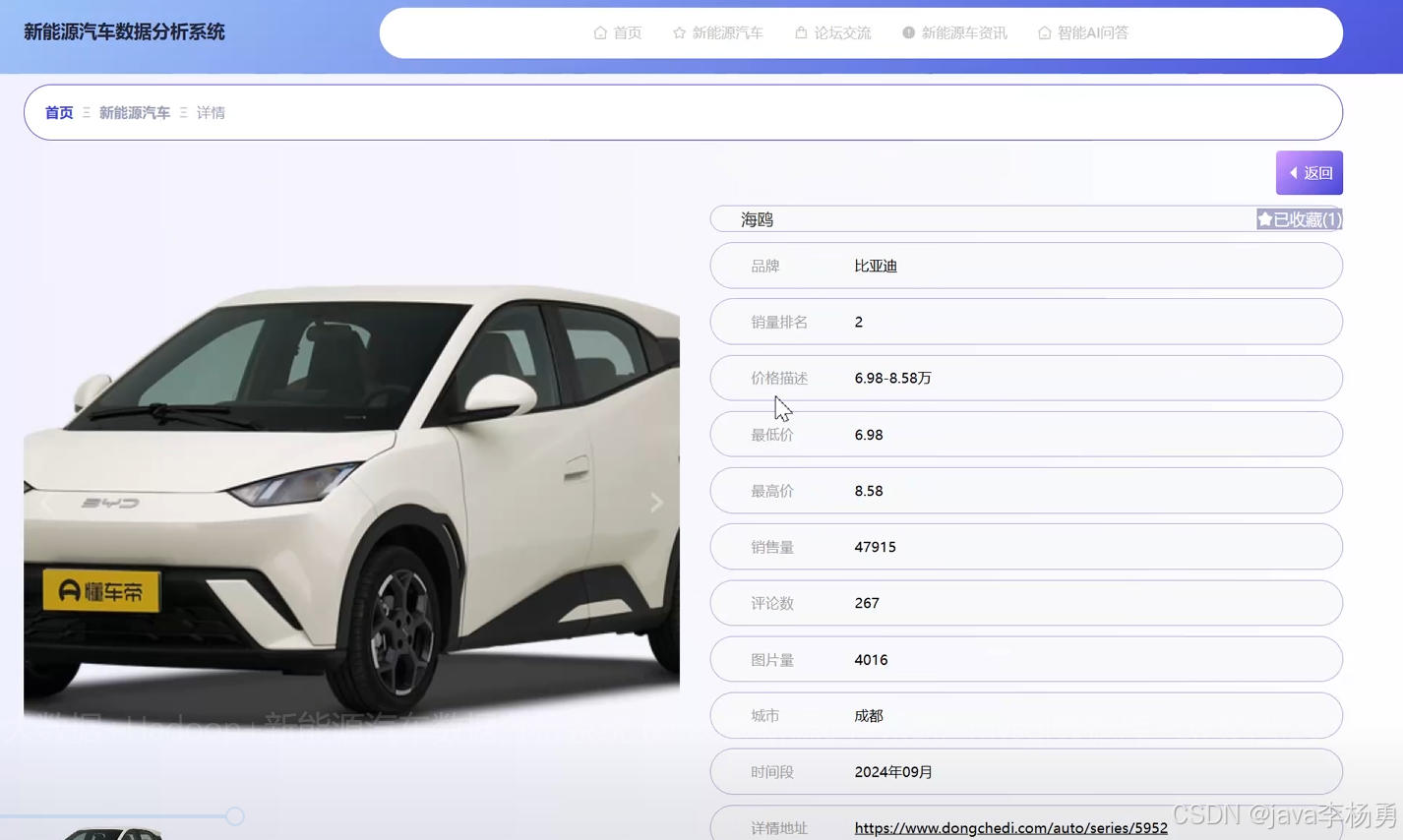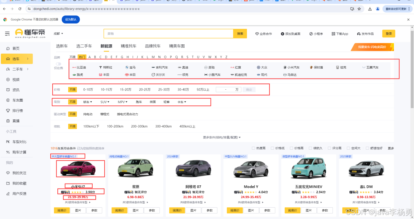 在基于大数据的新能源汽车数据分析系统开发中,数据获取是实现高效分析与精准洞察的关键步骤之一。本文所使用的数据主要来源于各大新能源汽车信息平台(如:https://www.dongchedi.com)。该平台聚合了大量关于新能源汽车的资讯资源,涵盖不同品牌、车型、动力类型、价格区间、续航能力等维度,用户可以根据自身需求浏览和比较各类新能源车型。懂车帝平台还提供了用户评论、购车意向、车型热度、销量排行等实时动态数据,并结合大数据技术呈现当前市场上的热销趋势、用户关注焦点及车型口碑分析等内容。这些信息为新能源汽车数据分析系统的构建与优化提供了重要的数据支撑。网页界面如下图所示。