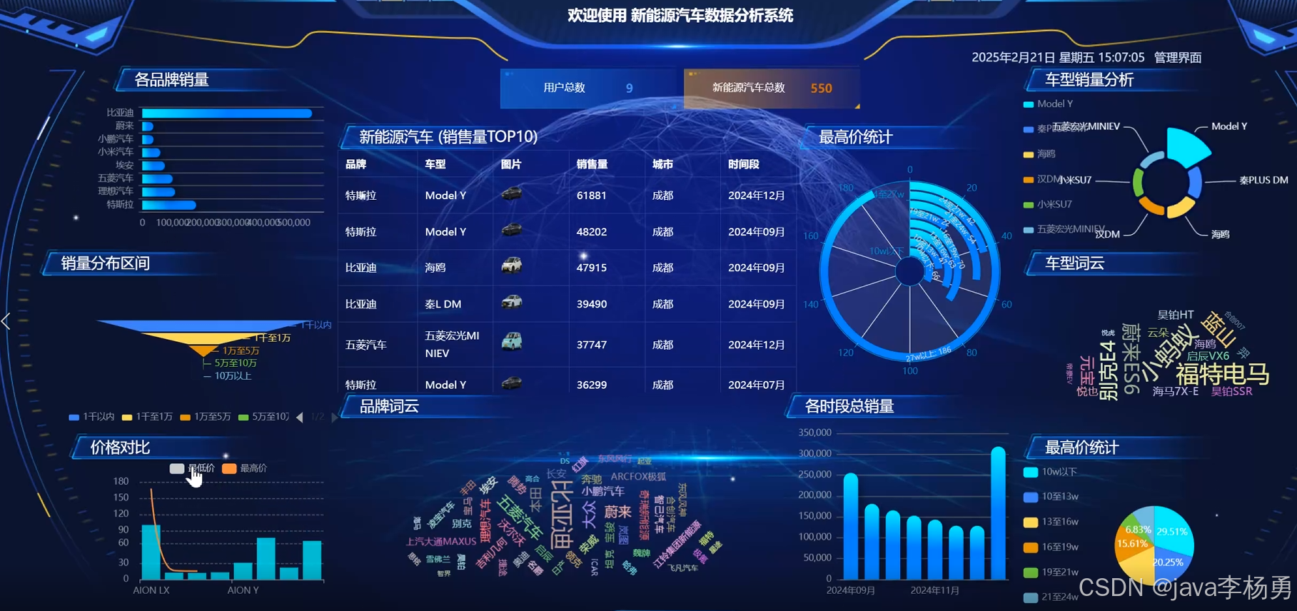 近年来,全球新能源汽车产业呈现出爆发式增长的态势,大量的新能源汽车相关数据不断涌现,如何对这些数据进行高效的分析与管理,已成为行业发展面临的关键问题。本毕业设计借助 Django 框架强大的功能特性,结合 MySQL 数据库卓越的结构化数据存储和管理能力,成功开发出一套功能完备的新能源汽车数据分析系统。