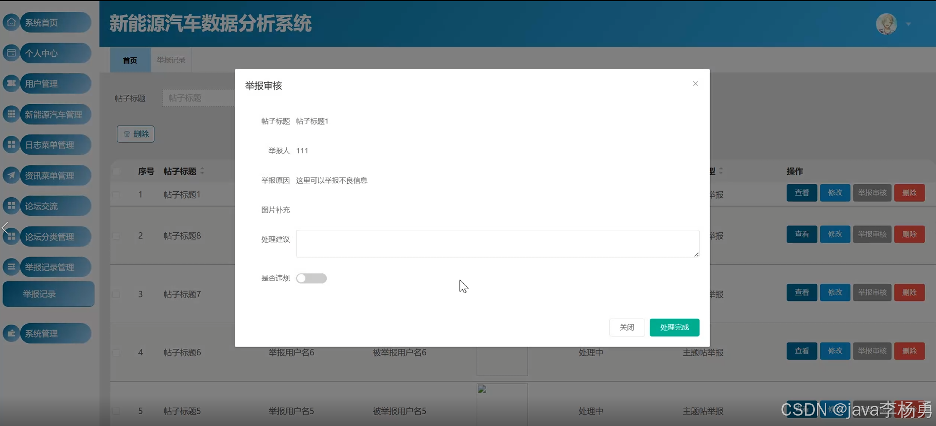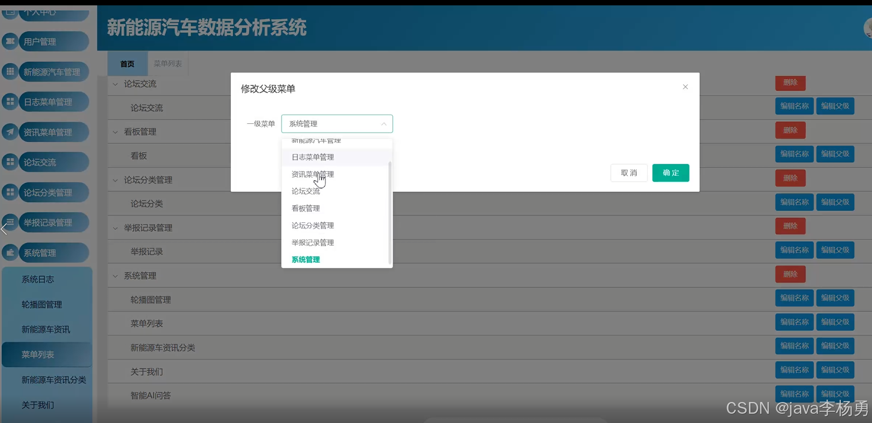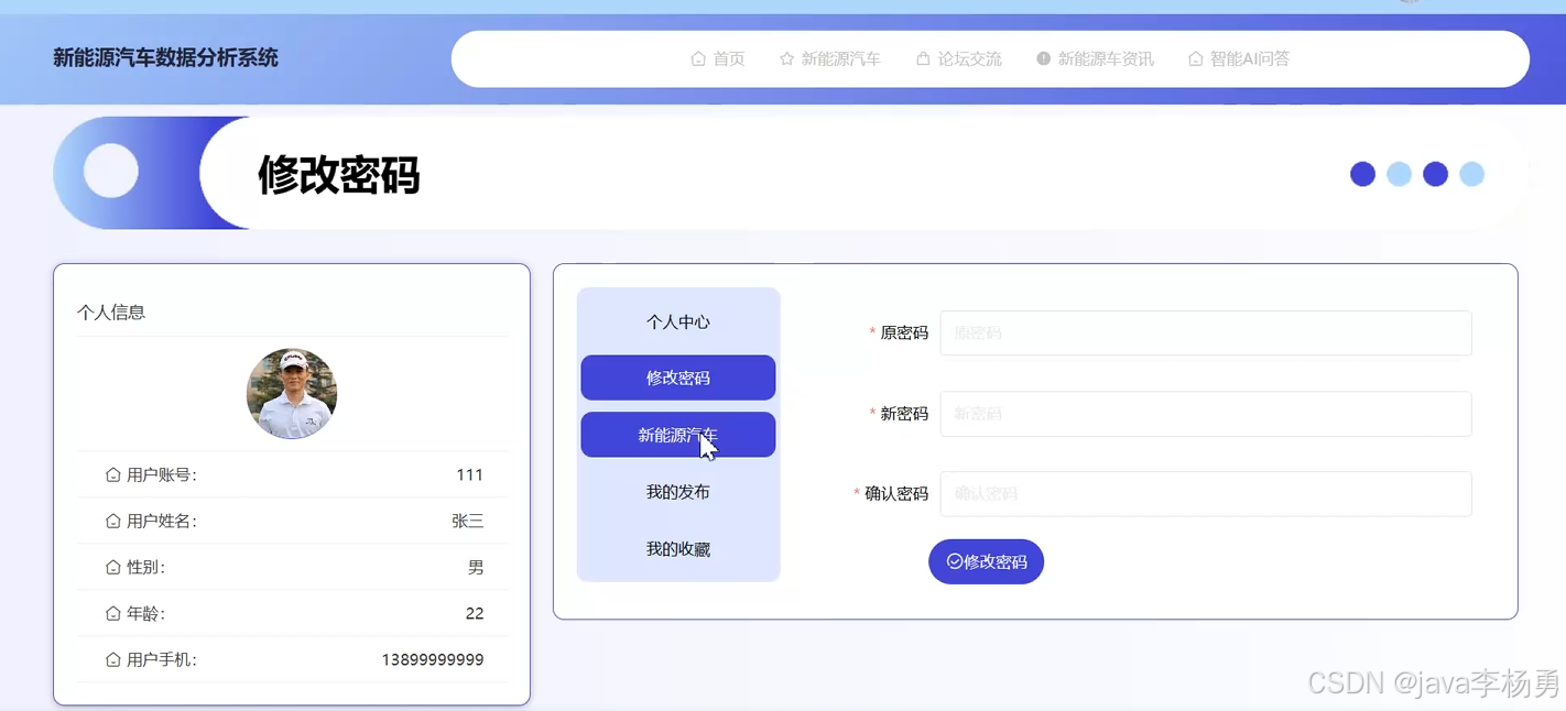 系统提供用户和管理员双视角功能。在用户端,用户注册登录后,能够在交流论坛各抒己见,碰撞思想火花,同时收藏有价值的信息。智能 AI 问答功能可在瞬间解答用户疑惑,提供准确专业的知识。还可浏览实时更新的新能源车资讯,时刻掌握行业动态。管理员端,不仅能够对用户信息、论坛内容、举报记录进行管理,还能对新能源汽车数据和资讯进行更新与维护。系统日志管理功能以时间线的形式详细记录系统操作,方便管理员复盘追溯;AI 问答管理模块通过算法优化与内容审核,保障了问答服务的质量与稳定性。