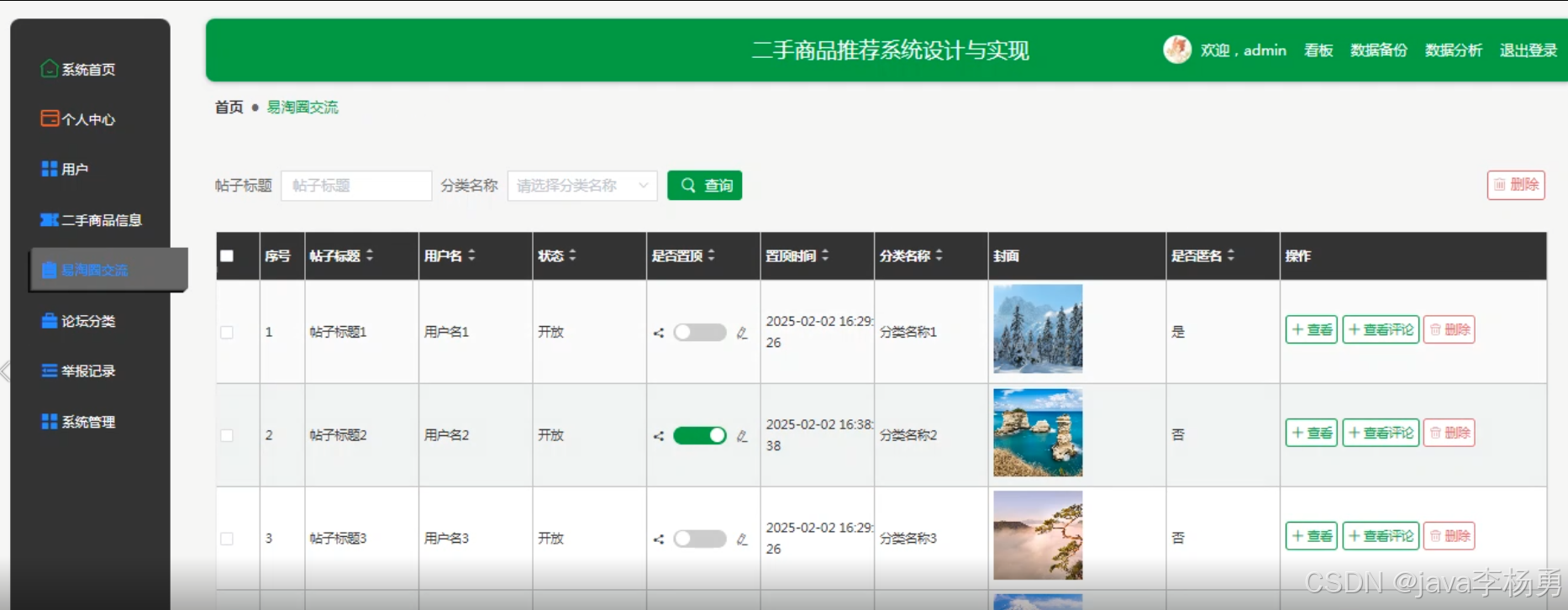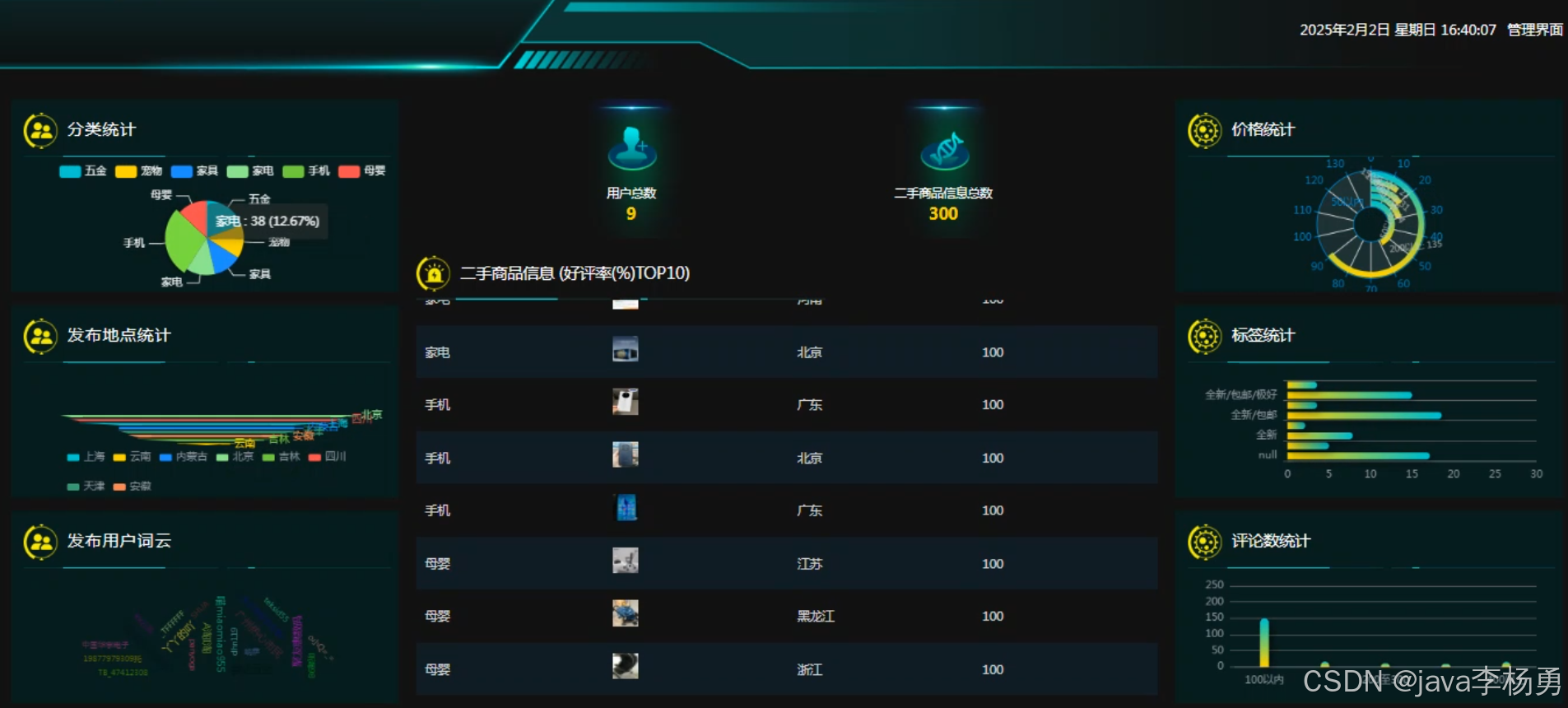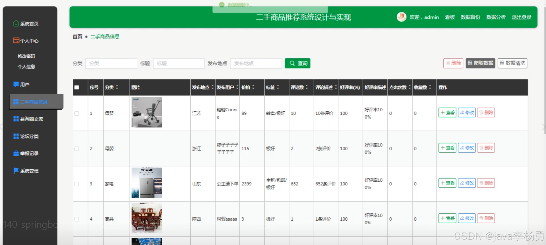 本项目所采用的数据来源主要基于从闲鱼网站爬取的二手商品信息和用户行为数据,涵盖商品种类、价格、销量、评价、用户浏览记录、购买历史等多维度信息。数据来源包括平台公开的二手商品信息、用户行为数据、商品评价与评论数据、促销活动数据等。这些数据在进入平台之前经过严格的数据清洗、去重和结构化处理,确保数据的准确性、完整性和时效性。平台通过对这些数据的分析,实现精准的商品推荐和用户匹配,提升交易成功率和用户体验。界面如下图所示。