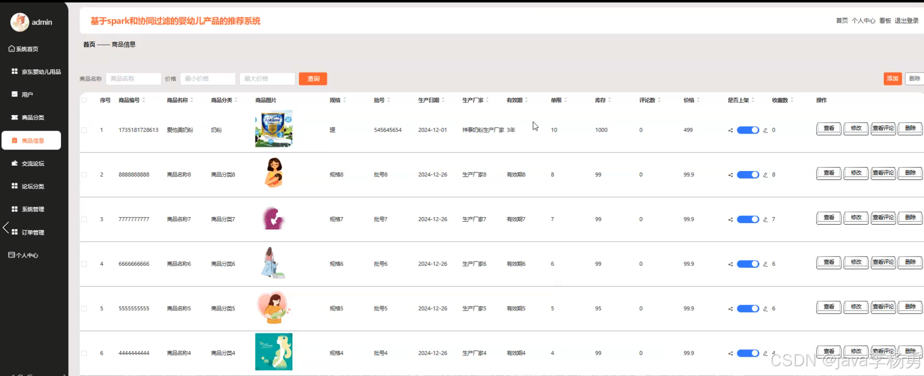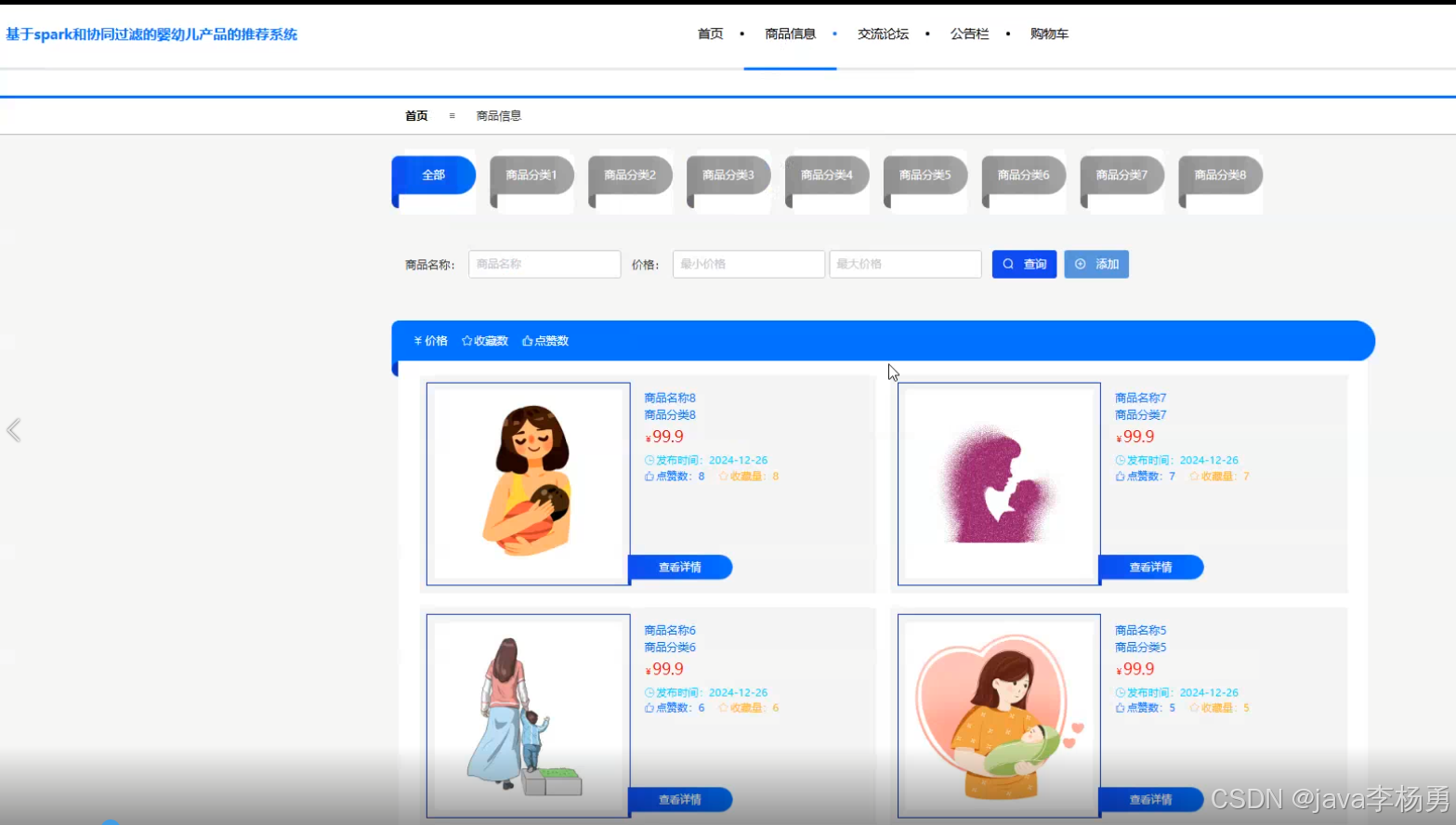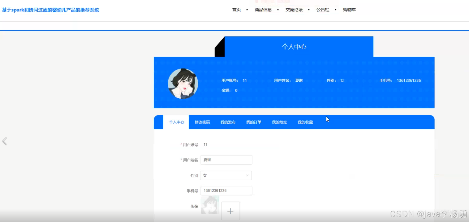 本研究聚焦于婴幼儿产品市场日益增长的个性化推荐需求,设计并实现了一套融合 Spark 分布式计算框架与协同过滤算法的智能化推荐系统。系统基于 Java EE 技术栈构建 B/S 架构,采用 MySQL 关系型数据库完成用户行为数据、商品信息及业务数据的结构化存储与管理,形成用户端与管理端双维度功能体系。用户端以提升消费体验为核心,集成注册登录、密码修改、订单全流程跟踪、公告资讯订阅、论坛社交互动、商品多维度检索、购物车动态管理及个人信息个性化设置等模块,尤其通过协同过滤算法对用户浏览记录、购买历史、收藏偏好等数据进行深度挖掘,实现奶粉分段、纸尿裤尺码、益智玩具类型等婴幼儿商品的精准化推荐;管理端则以数据驱动运营为目标,搭建数据大屏可视化模块,实时呈现用户增长趋势、热销商品排行、订单转化率等核心指标,并提供用户画像管理、订单状态管控、公告栏内容发布、论坛板块分类、商品类目维护、SKU 库存管理及管理员权限配置等功能,支持运营人员通过可视化界面对系统进行全生命周期管理。