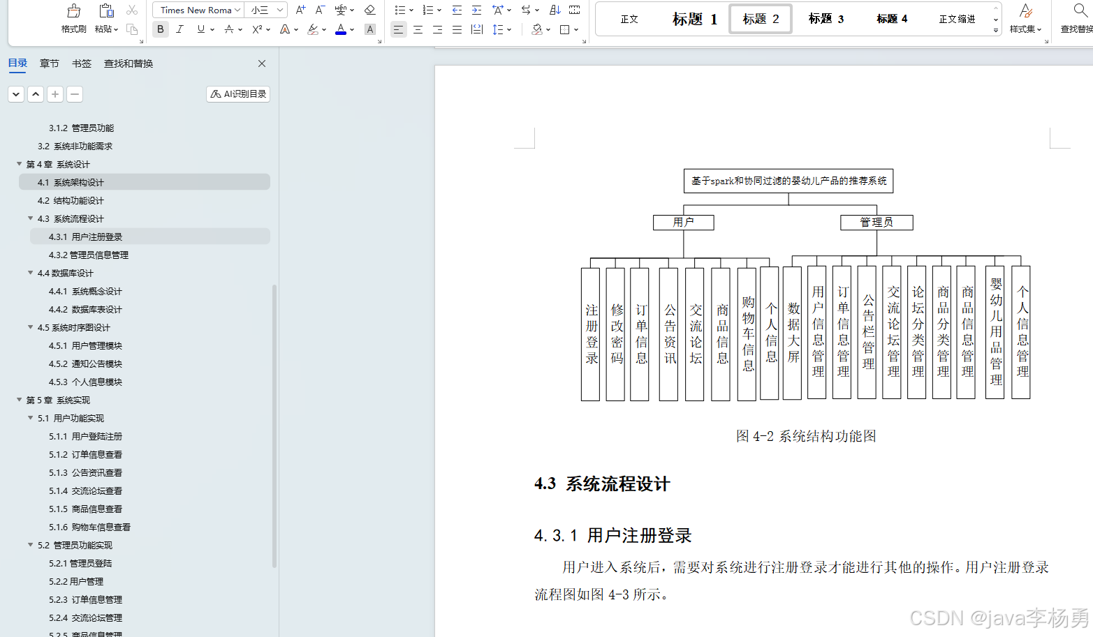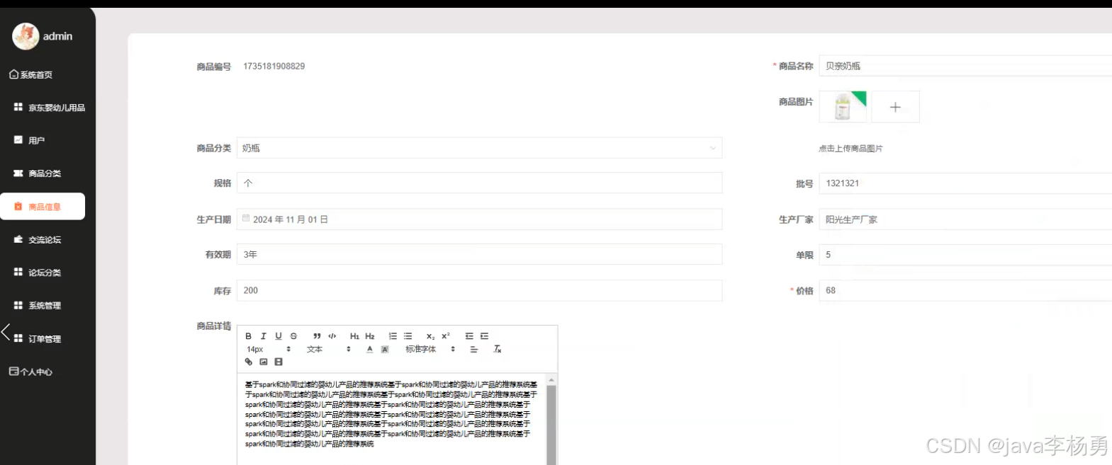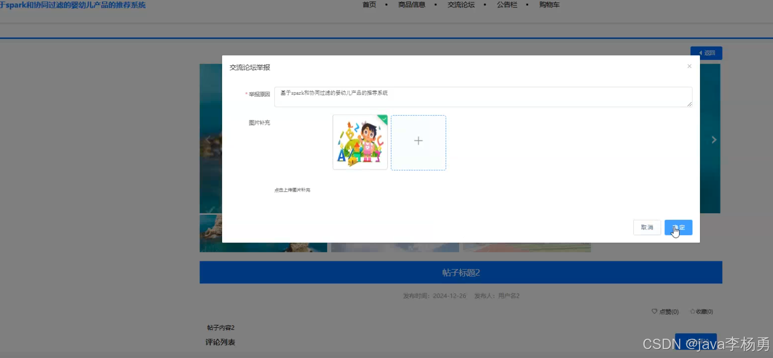 本研究聚焦于婴幼儿产品市场日益增长的个性化推荐需求,设计并实现了一套融合 Spark 分布式计算框架与协同过滤算法的智能化推荐系统。系统基于 Java EE 技术栈构建 B/S 架构,采用 MySQL 关系型数据库完成用户行为数据、商品信息及业务数据的结构化存储与管理,形成用户端与管理端双维度功能体系。用户端以提升消费体验为核心,集成注册登录、密码修改、订单全流程跟踪、公告资讯订阅、论坛社交互动、商品多维度检索、购物车动态管理及个人信息个性化设置等模块,尤其通过协同过滤算法对用户浏览记录、购买历史、收藏偏好等数据进行深度挖掘,实现奶粉分段、纸尿裤尺码、益智玩具类型等婴幼儿商品的精准化推荐;管理端则以数据驱动运营为目标,搭建数据大屏可视化模块,实时呈现用户增长趋势、热销商品排行、订单转化率等核心指标,并提供用户画像管理、订单状态管控、公告栏内容发布、论坛板块分类、商品类目维护、SKU 库存管理及管理员权限配置等功能,支持运营人员通过可视化界面对系统进行全生命周期管理。