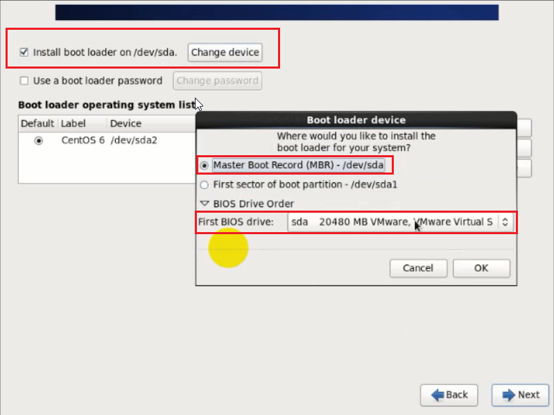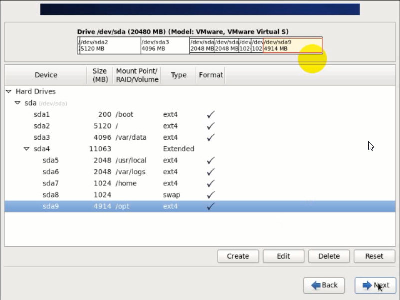 3.10 由于虚拟机只有一个磁盘, 所以只有一个 sda. 在使用u 盘安装物理机时, 如果只有一个磁盘, 那么会显示sda, sdb, 其中 sda 为电脑磁盘, sdb 为u 盘, 我们应该选择sda . 如果sda 有多个分区, 我们只想在某个分区安装系统, 那么我们只删除这一个分区, 在这一个分区上创建新的分区即可. [点击 create, 弹出提示框, 在点击 弹出框的 create]