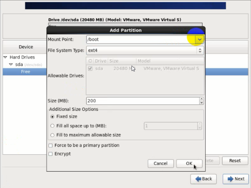 3.11 文件系统(File System Type)有多种, 通常我们只需要用到两种, 一种是swap 分区, 一种是 ext4 分区. swap 类型只用于创建swap 分区, 其它类型分区都用ext4 类型. Mount Point 为分区名称, 可选择, 可自己手写; File System Type 为选择文件系统类型; Allowable Dri