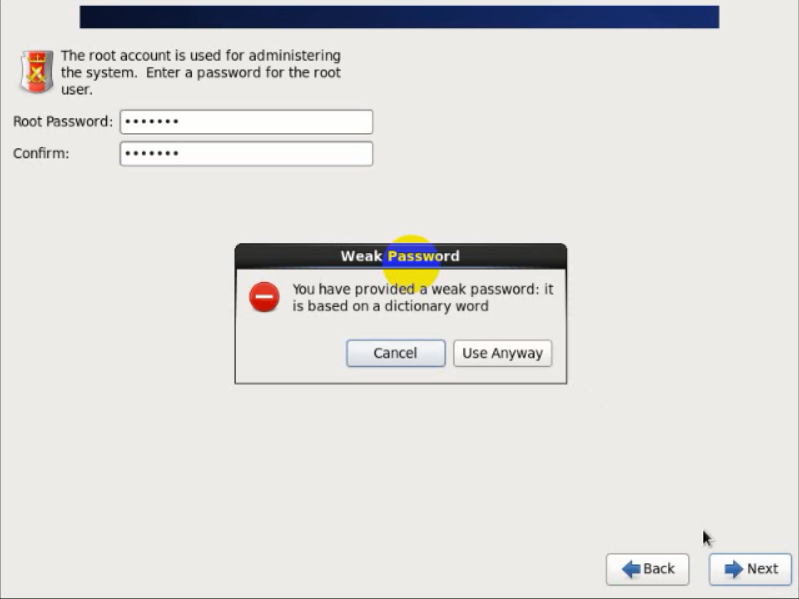 3.8 设置超级用户root 密码, 建议设置比较复杂的密码, 如果设置的密码比较简单, 会弹出此提示, 如果实在任性, 那就 [点击 Use Anyway ]