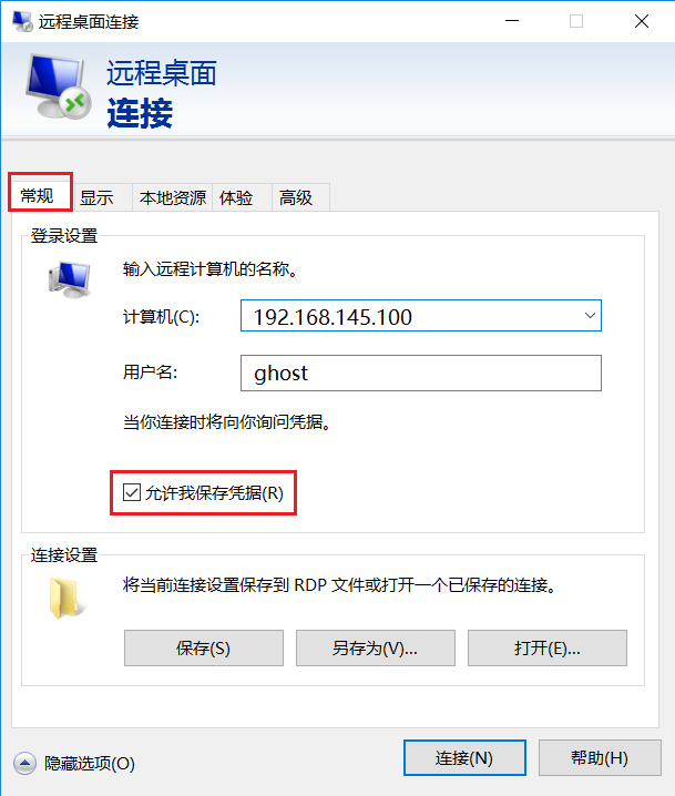 在常规选项中, 输入服务器ip 和 用户名, 并勾选允许我保存凭据. 否则的话每次连接都必须输入密码, 比较麻烦.