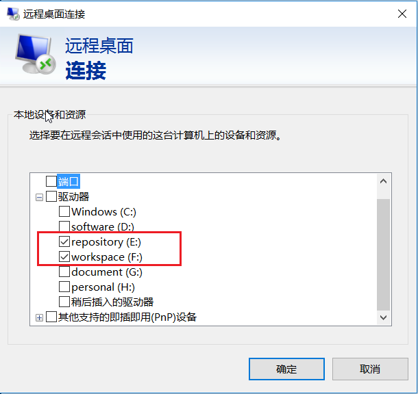 点击驱动器, 选择要共享的磁盘. 选择共享的磁盘会在远程连接窗口中的我的电脑中显示, 这是为了实现本地与windows服务器之间文件传输的功能.